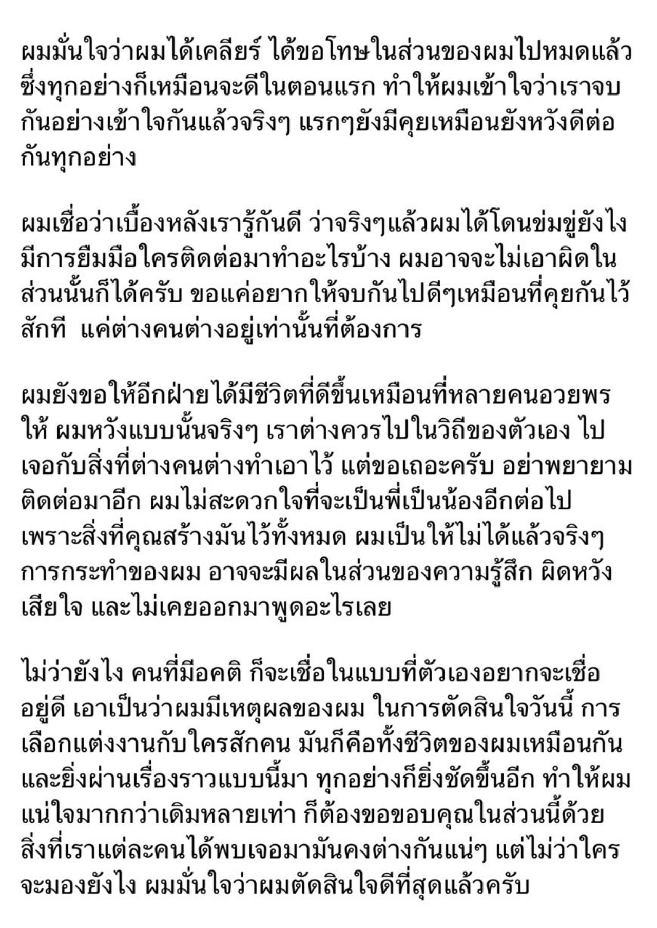 ผมยังขอให้อีกฝ่ายได้มีชีวิตที่ดีขึ้นเหมือนที่หลายคนอวยพรให้ ผมหวังแบบนั้นจริงๆ เราต่างควรไปในวิถีของตัวเอง ไปเจอกับสิ่งที่ต่างคนต่างทำเอาไว้ แต่ขอเถอะครับ อย่าพยายามติดต่อมาอีก ผมไม่สะดวกใจที่จะเป็นพี่เป็นน้องอีกต่อไป เพราะสิ่งที่คุณสร้างมันไว้ทั้งหมด ผมเป็นให้ไม่ได้แล้วจริงๆ การกระทำของผม อาจจะมีผลในส่วนของความรู้สึก ผิดหวัง เสียใจ และไม่เคยออกมาพูดอะไรเลย