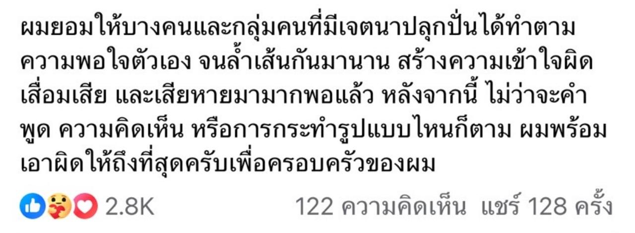 ผมยอมให้บางคนและกลุ่มคนที่มีเจตนาปลุกปั่นได้ทำตามความพอใจตัวเอง จนล้ำเส้นกันมานาน สร้างความเข้าใจผิด เสื่อมเสีย และเสียหายมามากพอแล้ว หลังจากนี้ ไม่ว่าจะคำพูด ความคิดเห็น หรือการกระทำรูปแบบไหนก็ตาม ผมพร้อมเอาผิดให้ถึงที่สุดครับเพื่อครอบครัวของผม"