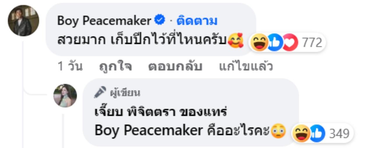 งานนี้ นอกจากแฟนๆ จะแห่เข้ามาคอมเมนต์ชมในความสวยของ เจี๊ยบ แล้ว ด้านสามีอย่าง บอย พีซเมกเกอร์ ก็ได้เข้ามาคอมเมนต์ชื่นชมในความสวยของภรรยาบอกว่า "สวยมาก เก็บปีกไว้ที่ไหน?" ซึ่ง บอย ตั้งใจจะสื่อว่า เจี๊ยบ สวยเหนือมนุษย์ สวยเหมือนนางฟ้า