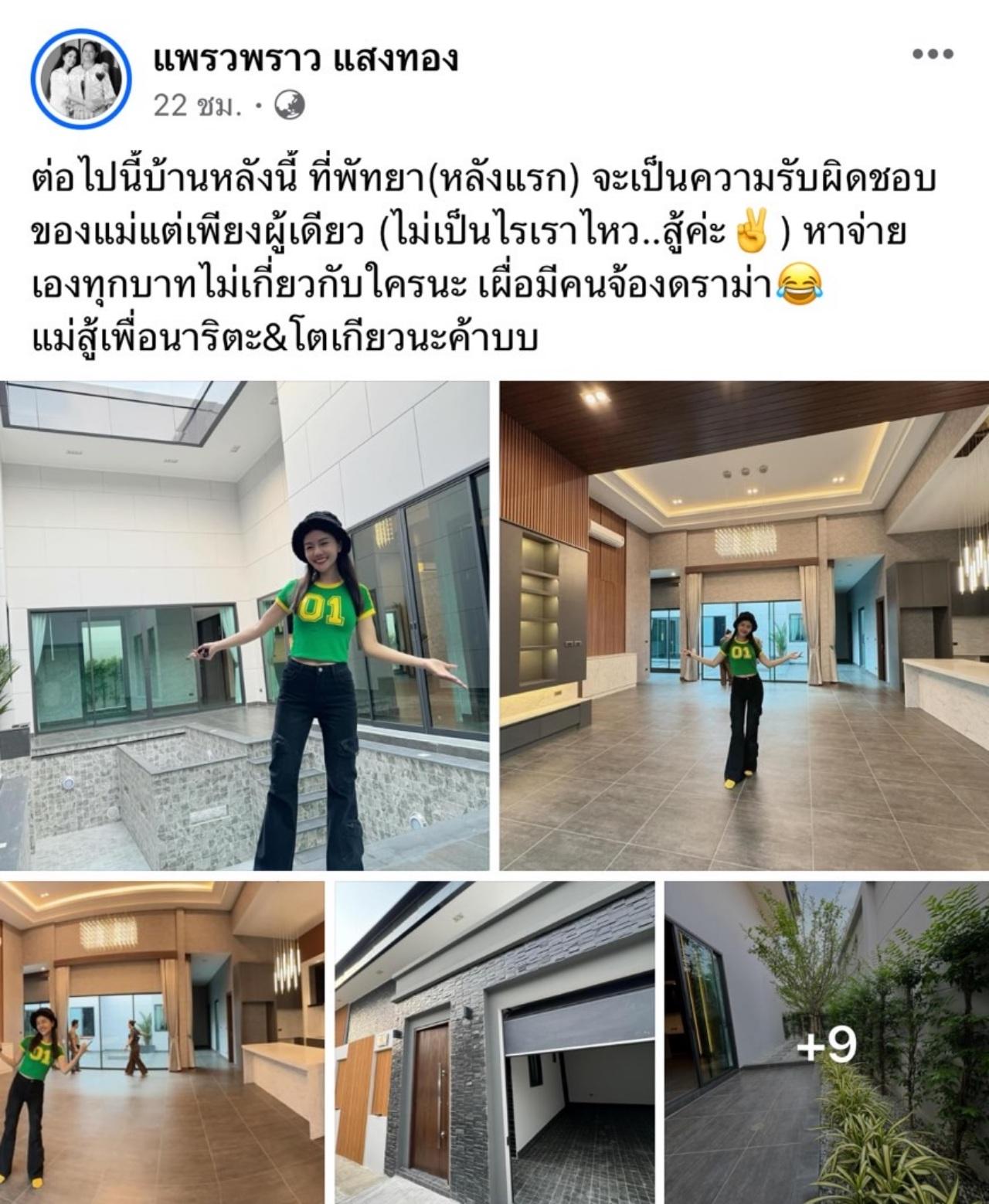 นอกจากนี้ แพรวพราว ก็ได้เผยภาพบ้านหลังใหม่ที่พัทยา ซึ่งเคยซื้อไว้ตั้งใจทำเป็นบ้านพักตากอากาศ ตอนนี้กำลังอยู่ในช่วงตกแต่งบ้าน หลายคนที่ติดตามก็ได้เข้ามาให้กำลังใจแม่แพรวพราวกันจำนวนมาก.