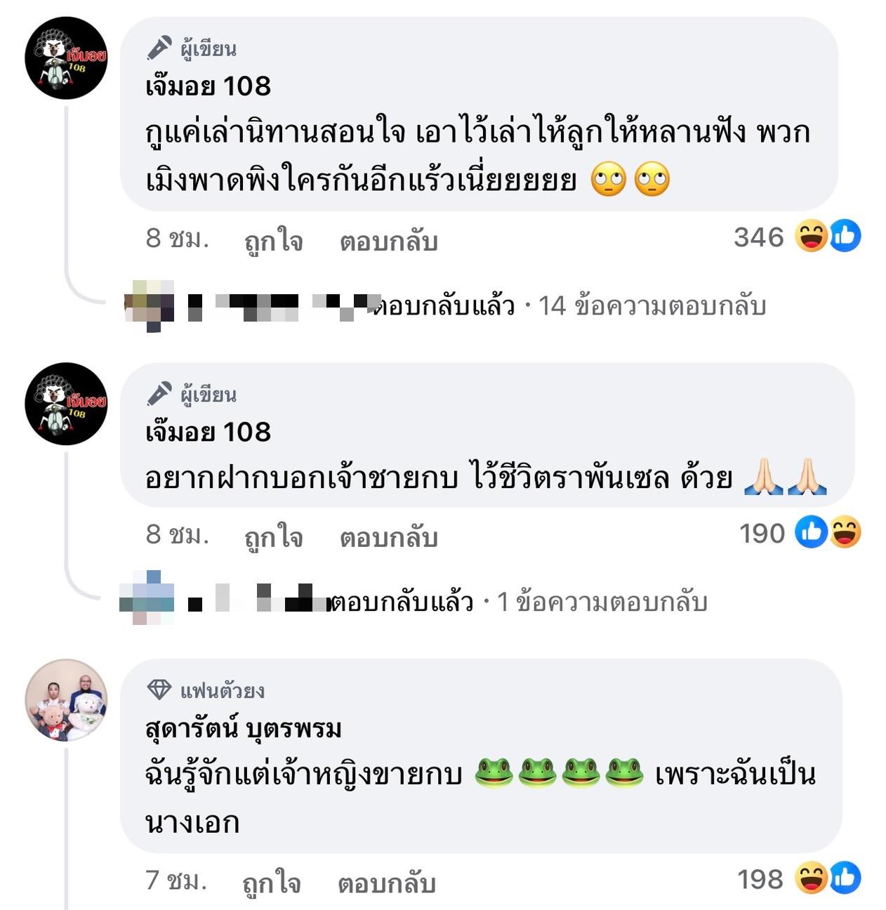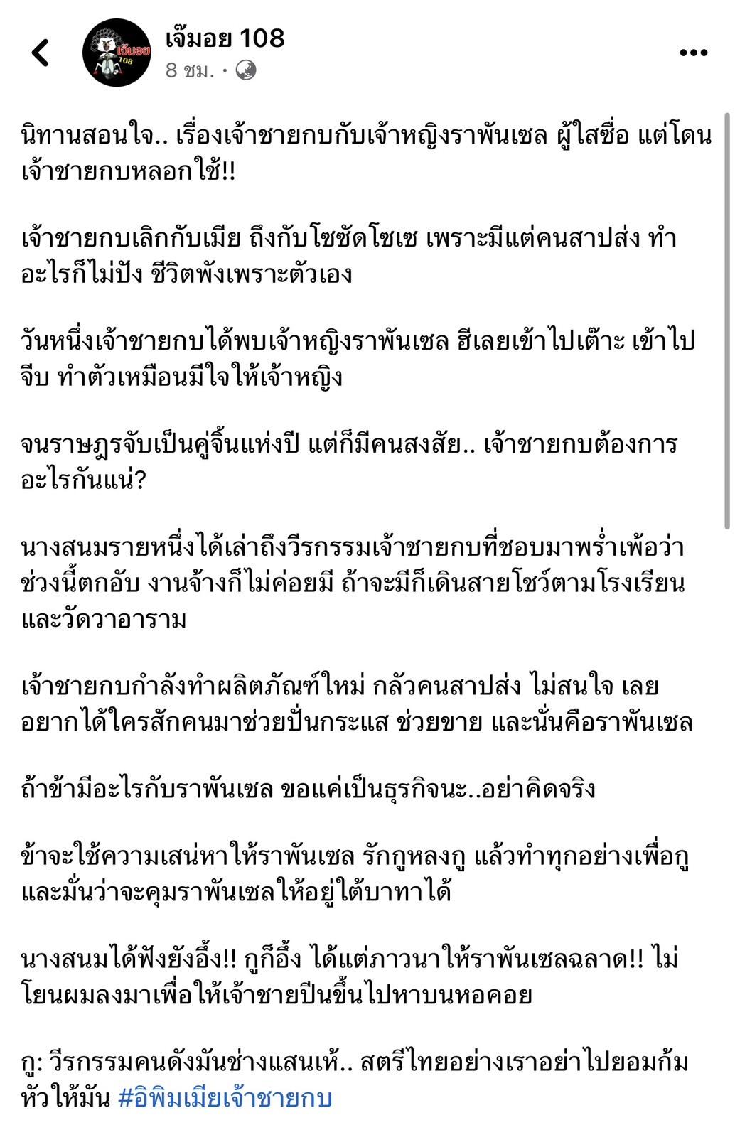 หลังจากเพจบันเทิงดัง เจ๊มอย 108 ออกมาโพสต์ข้อความเล่านิทานสอนใจ "เจ้าชายกบเลิกเมีย แล้วได้พบเจ้าหญิงราพันเซล เลยเข้าไปจีบ ทำตัวเหมือนมีใจ จนคนจับเป็นคู่จิ้นแห่งปี แต่มีคนมาแฉว่าเจ้าชายกบแค่หลอกใช้ อยากให้มาช่วยปั่นกระแส ทำไปเพราะแค่เรื่องธุรกิจเท่านั้น"