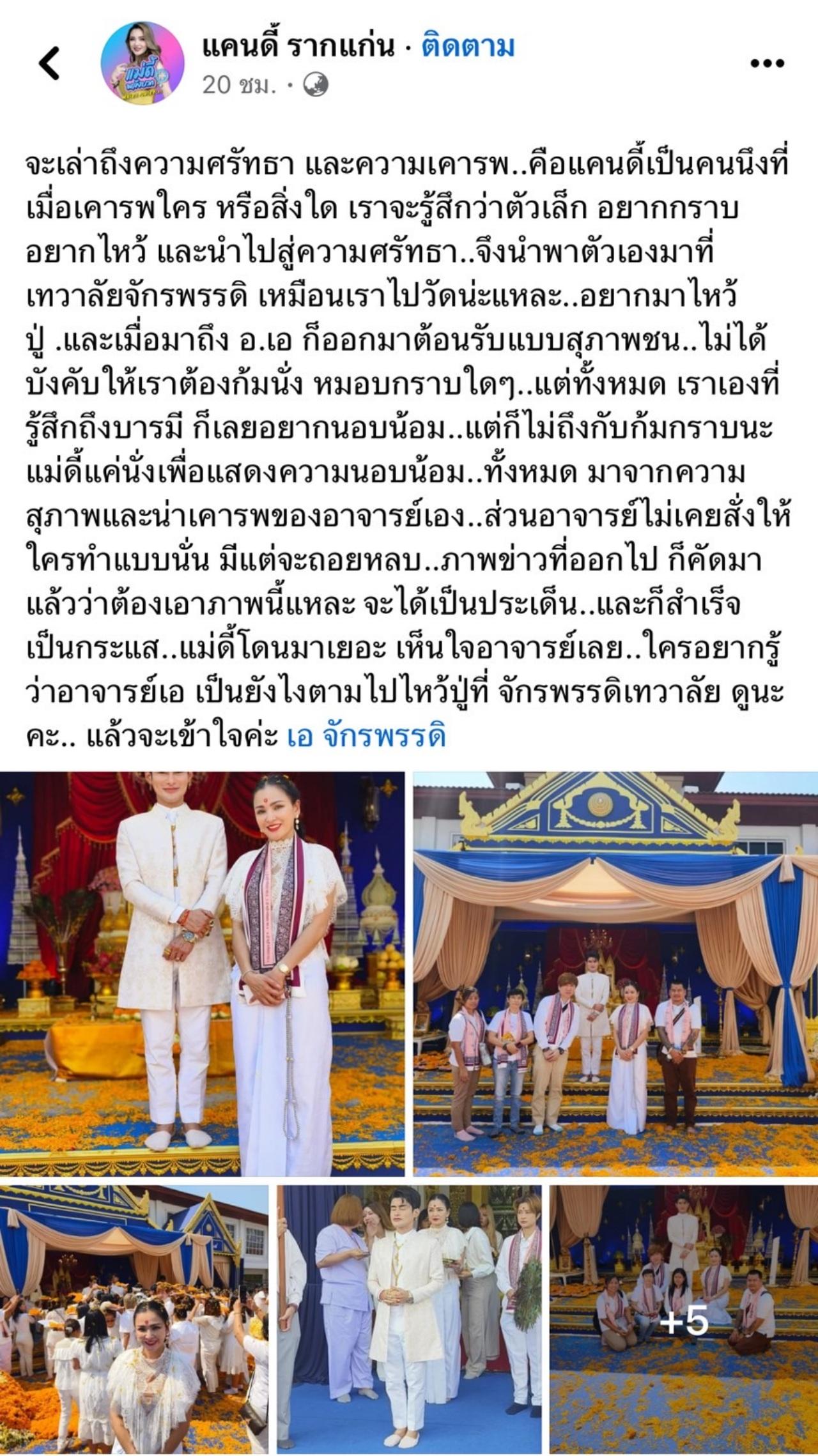 ทางด้านนักร้องสาว แคนดี้ รากแก่น ก็ได้โพสต์ข้อความผ่านเฟซบุ๊ก ได้เล่าถึงความศรัทธา และความเคารพของตัวเองที่มีต่อ อาจารย์เอ จักรพรรดิ พร้อมยืนยันว่า อาจารย์เอ ไม่เคยสั่งให้ใครก้มกราบ หรือหมอบ แค่นั่งเพื่อแสดงความนอบน้อม ภาพข่าวที่ออกไปเขาคัดมาแล้วว่าเป็นประเด็น รู้สึกเห็นใจอาจารย์ พร้อมกับทิ้งท้ายว่า ถ้าใครอยากรู้ว่า อาจารย์เอ เป็นยังไง ตามไปไหว้ได้ที่ จักรพรรดิเทวาลัย แล้วจะเข้าใจ