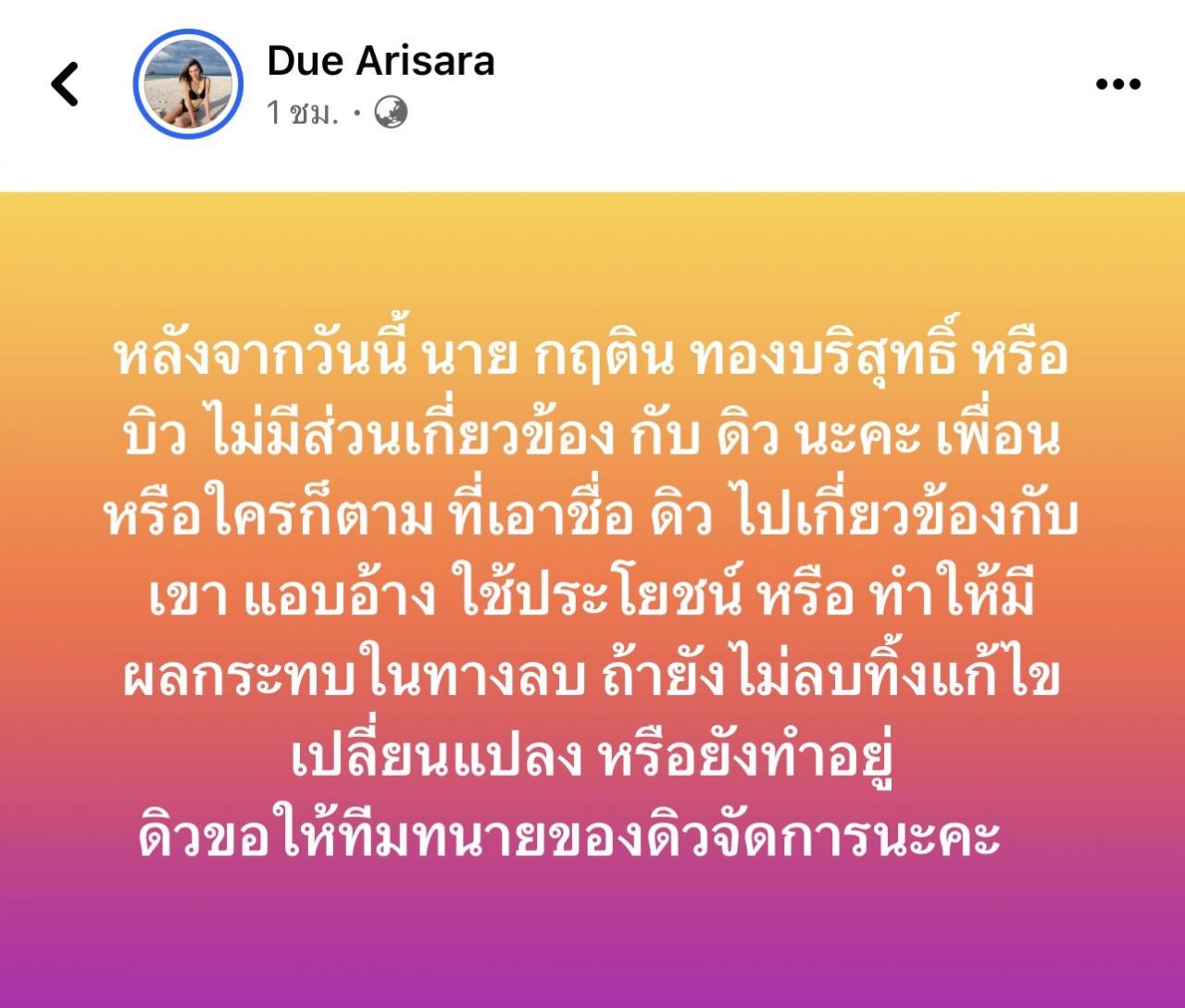 ล่าสุด สาวดิว อริสรา ออกมาประกาศแล้วว่าหลังจากนี้พี่ชายไม่มีส่วนเกี่ยวข้องกับเธอแล้ว โดยระบุว่า "หลังจากวันนี้ นายกฤติน ทองบริสุทธิ์ หรือ บิว ไม่มีส่วนเกี่ยวข้องกับ ดิว นะคะ เพื่อน หรือใครก็ตาม ที่เอาชื่อ ดิว ไปเกี่ยวข้องกับเขา แอบอ้าง ใช้ประโยชน์ หรือทำให้มีผลกระทบในทางลบ ถ้ายังไม่ลบทิ้งแก้ไขเปลี่ยนแปลง หรือยังทำอยู่ ดิวขอให้ทีมทนายของดิวจัดการนะคะ"