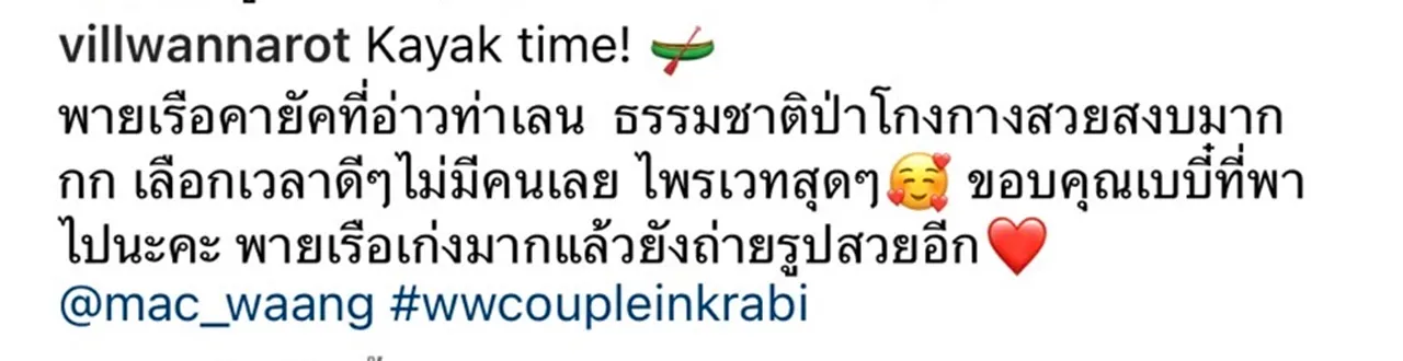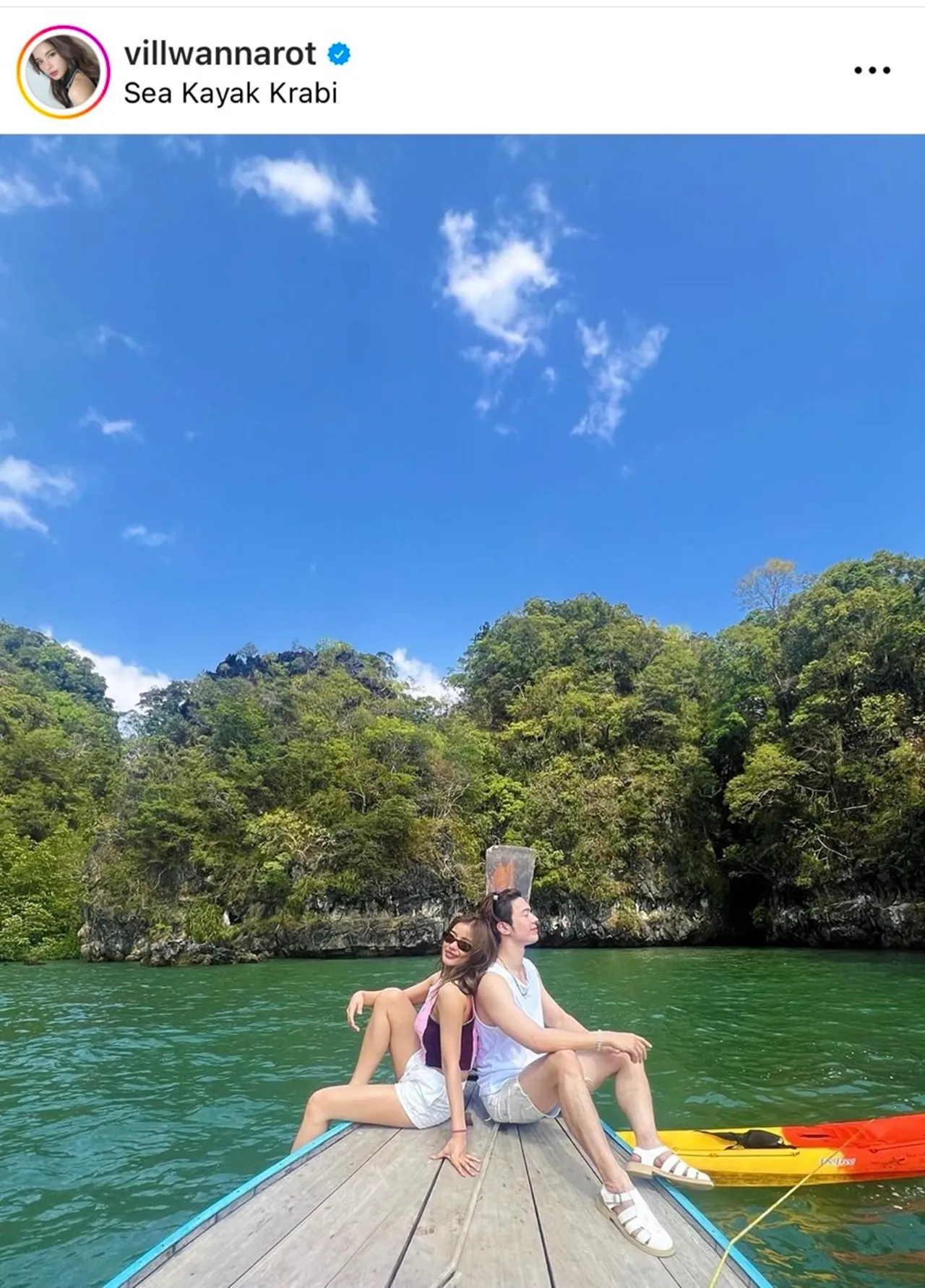ล่าสุด แม็ค-วิว ควงกันไปเที่ยวรับลมทะเล จังหวัดกระบี่ แถมยังชวนกันไปทำกิจกรรมพายเรือคายัค ชมความสวยงามของธรรมชาติ โดย สาววิว ได้โพสต์ภาพคู่อวดความหวาน ลงบนอินสตาแกรมส่วนตัว พร้อมเขียนข้อความว่า