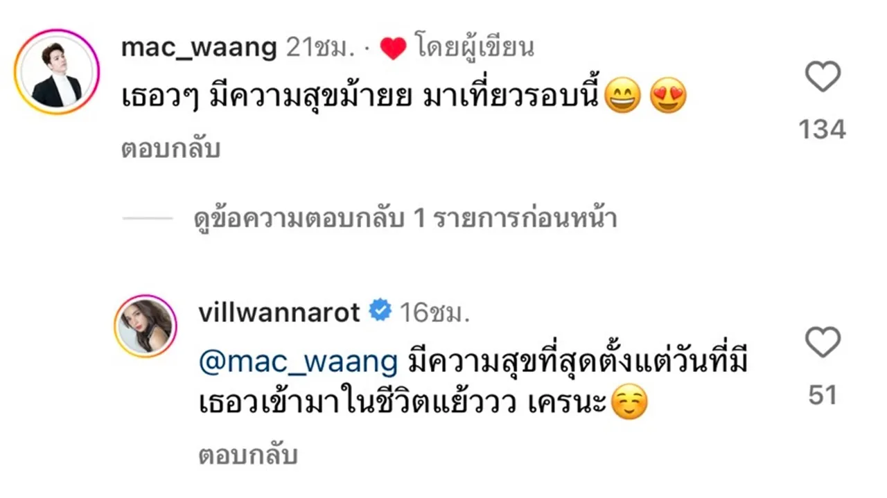 ด้าน แม็ค ไม่รอช้า เข้ามาคอมเมนต์ถามแฟนสาวว่า "เธอวๆ มีความสุขม้ายย มาเที่ยวรอบนี้" และคำตอบที่ วิว ตอบกลับก็หวานฉ่ำ ทำเอาคนโสดตายเรียบ "มีความสุขที่สุดตั้งแต่วันที่มีเธอวเข้ามาในชีวิตแย้ววว เครนะ".
