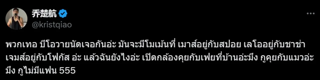 โดยก่อนหน้านี้ เต็งหนึ่ง เคยโพสต์ข้อความตัดพ้อ ผ่านทาง X (ทวิตเตอร์) ว่า "พวกเทอ บีโอวายนัดเจอกันอ่ะ มันจะมีโมเม้นที่ เมาส์อยู่กับสปอย เลโออยู่กับชาช่า เจมส์อยู่กับโฟกัส อ่ะ แล้วฉันยังไงอ่ะ เปิดกล้องคุยกับเฟยที่บ้านอ่ะมึง กูคุยกับแมวอ่ะมึง กูไม่มีแฟน 555"