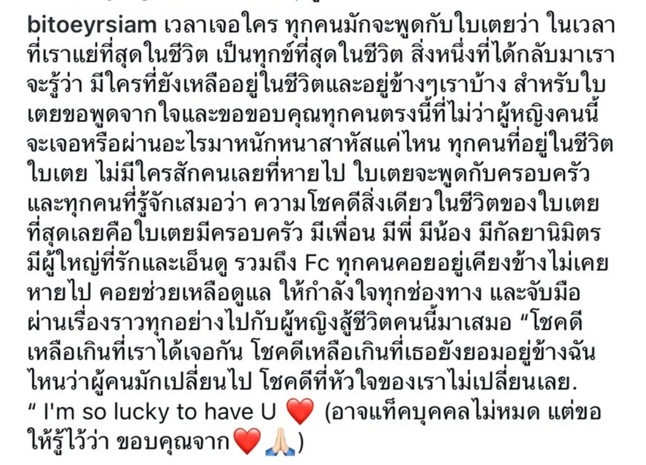 โชคดีเหลือเกินที่เราได้เจอกัน โชคดีเหลือเกินที่เธอยังยอมอยู่ข้างฉัน ไหนว่าผู้คนมักเปลี่ยนไป โชคดีที่หัวใจของเราไม่เปลี่ยนเลย. I'm so lucky to have U (อาจแท็คบุคคลไม่หมด แต่ขอให้รู้ไว้ว่า ขอบคุณจากใจ)".
