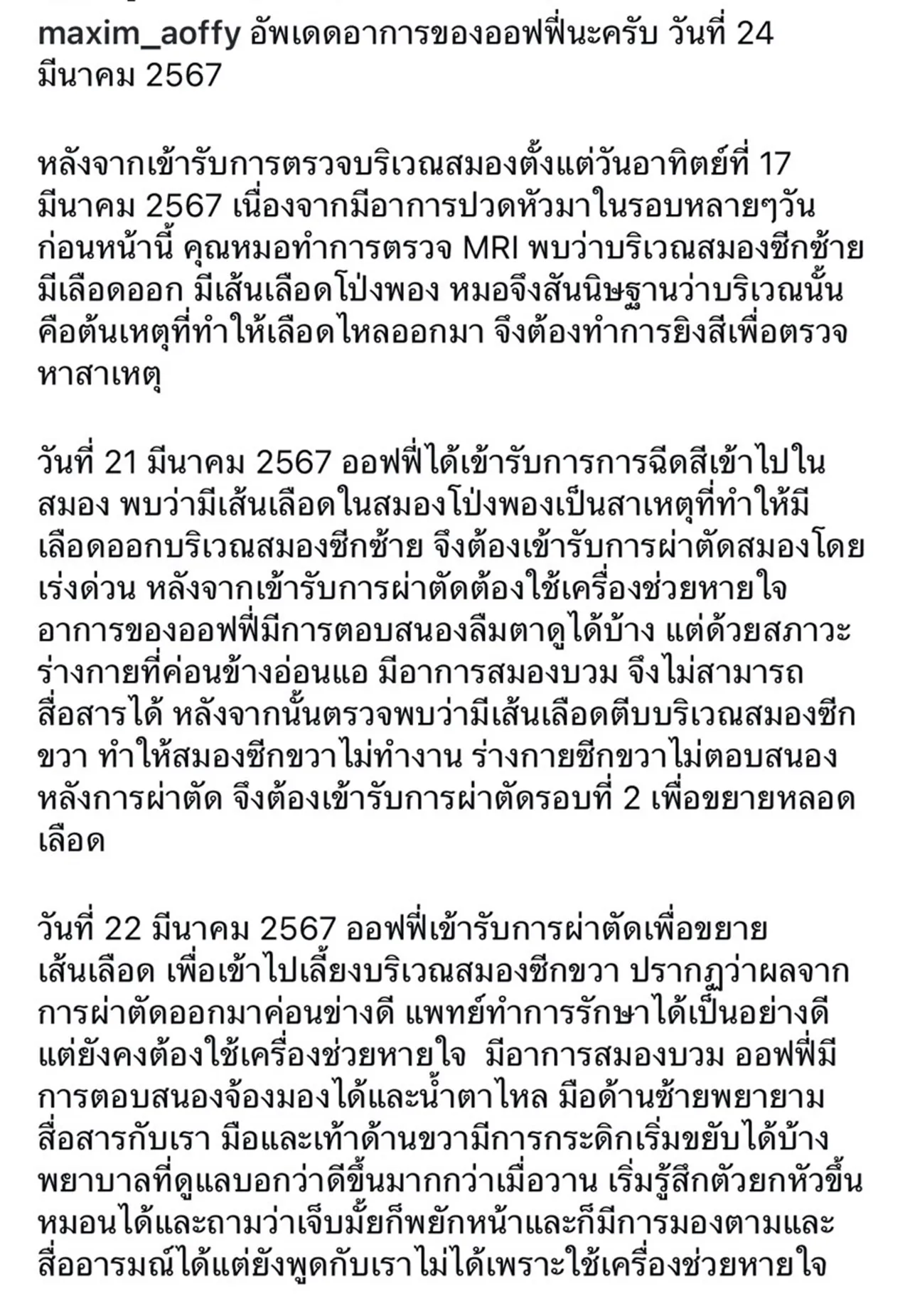 วันที่ 23 มีนาคม 2567 อาการของออฟฟี่ตอนนี้ยังทรงตัวอยู่ ในห้อง ICU ยังคงให้ยาลดอาการสมองบวม ต้องอยู่ในการดูแลของแพทย์อย่างใกล้ชิด ทุกอย่างเป็นไปในทิศทางที่ดีขึ้น