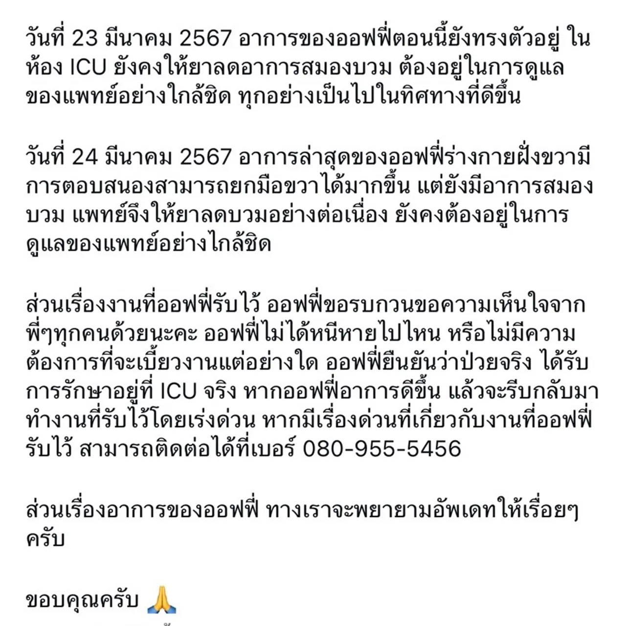 ส่วนเรื่องงานที่ออฟฟี่รับไว้ ออฟฟี่ขอรบกวนขอความเห็นใจจากพี่ๆทุกคนด้วยนะคะ ออฟฟี่ไม่ได้หนีหายไปไหน หรือไม่มีความต้องการที่จะเบี้ยวงานแต่อย่างใด ออฟฟี่ยืนยันว่าป่วยจริง ได้รับการรักษาอยู่ที่ ICU จริง หากออฟฟี่อาการดีขึ้น แล้วจะรีบกลับมาทำงานที่รับไว้โดยเร่งด่วน หากมีเรื่องด่วนที่เกี่ยวกับงานที่ออฟฟี่รับไว้ สามารถติดต่อได้ที่เบอร์ 080-955-5456