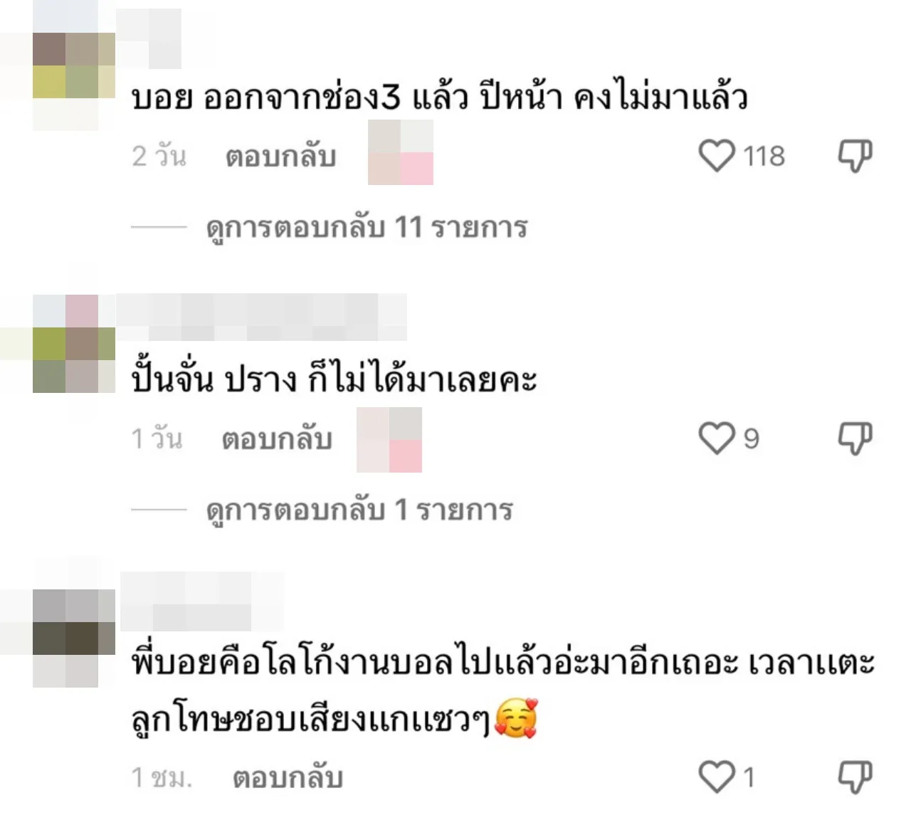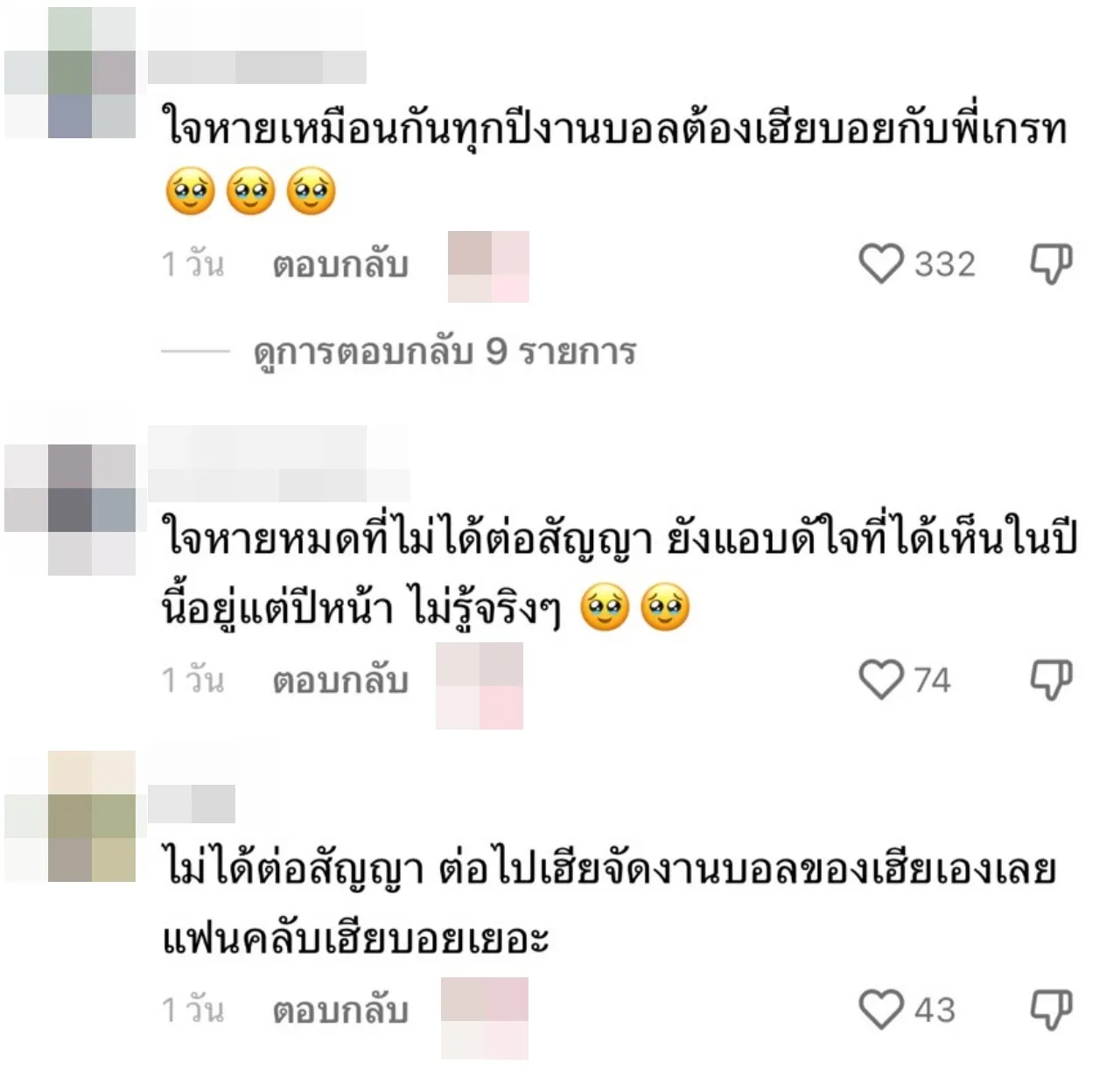 หลายคนก็ได้เข้ามาคอมเมนต์กันจำนวนมาก โดยบอกว่า ใจหายเหมือนกันทุกปีงานบอลต้องเฮียบอยกับพี่เกรท, ใจหายหมดที่ไม่ได้ต่อสัญญา ยังแอบดีใจที่ได้เห็นในปีนี้อยู่แต่ปีหน้า ไม่รู้จริงๆ, ไม่ได้ต่อสัญญา ต่อไปเฮียจัดงานบอลของเฮียเองเลย แฟนคลับเฮียบอยเยอะ, บอย ออกจากช่อง3 แล้ว ปีหน้า คงไม่มาแล้ว เป็นต้น.
