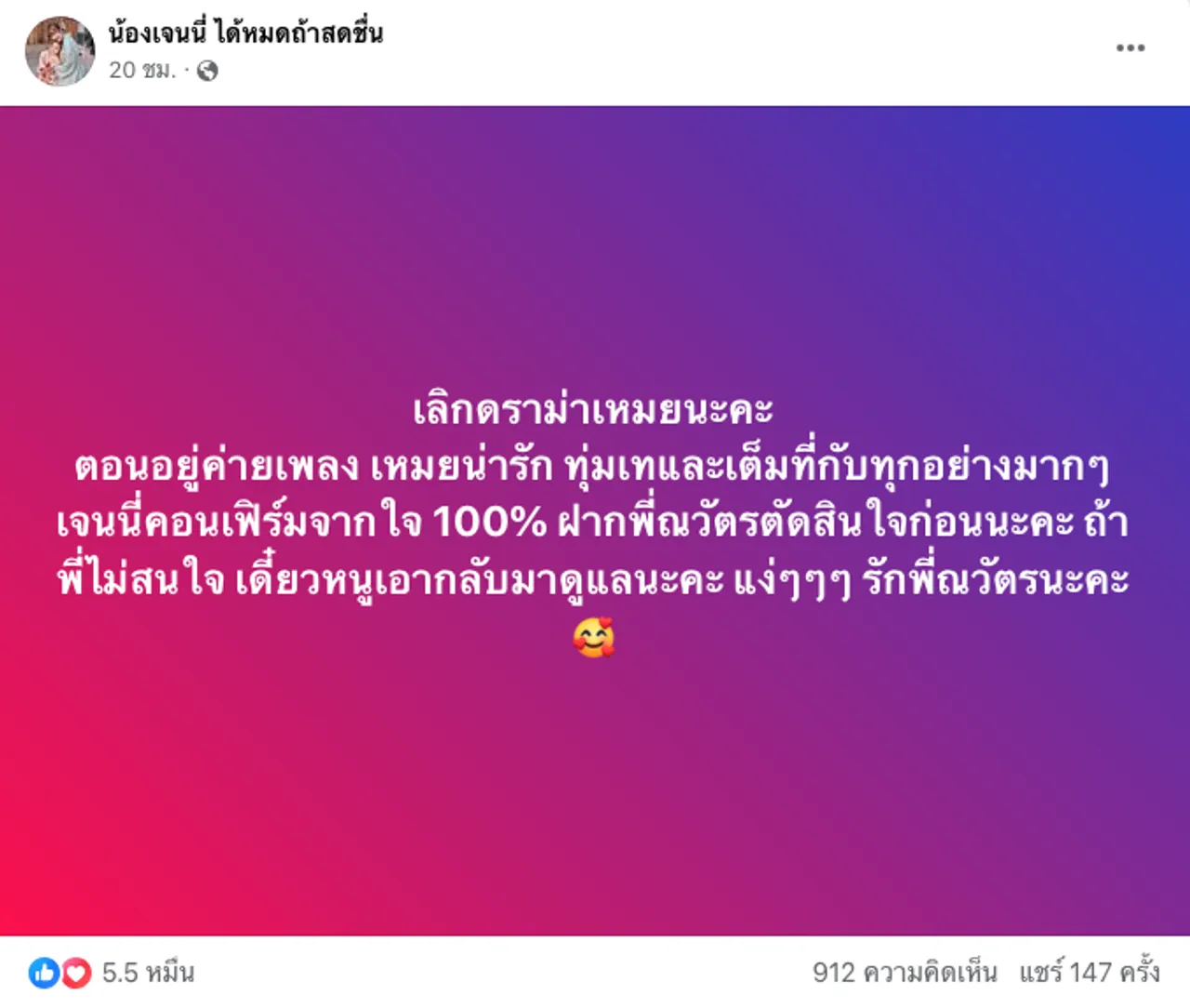 "เลิกดราม่าเหมยนะคะ ตอนอยู่ค่ายเพลง เหมยน่ารัก ทุ่มเทและเต็มที่กับทุกอย่างมากๆ เจนนี่คอนเฟิร์มจากใจ 100% ฝากพี่ณวัตรตัดสินใจก่อนนะคะ ถ้าพี่ไม่สนใจ เดี๋ยวหนูเอากลับมาดูแลนะคะ แง่ๆๆๆ รักพี่ณวัตรนะคะ"