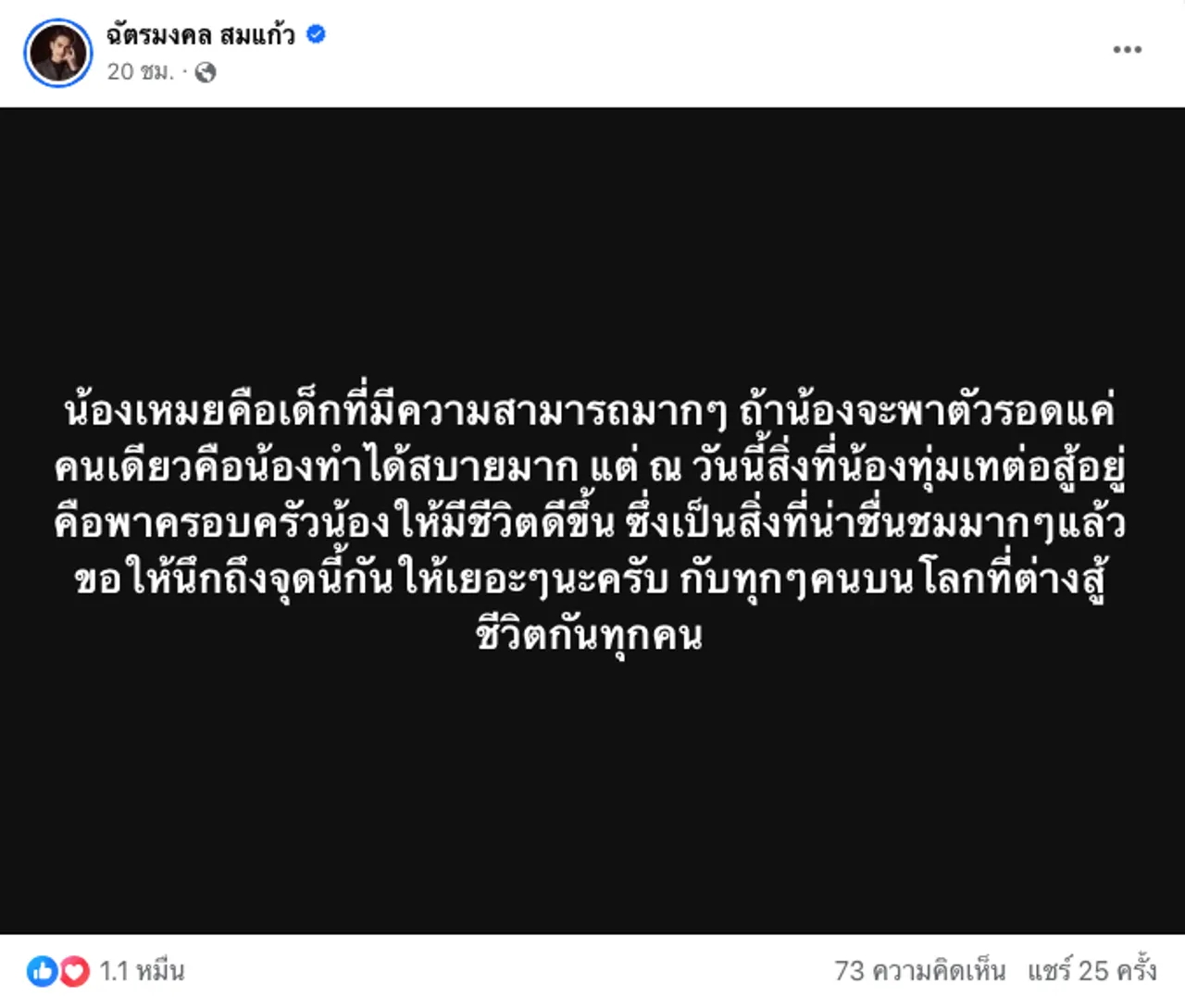 ส่วนทางด้าน ยิว ฉัตรมงคล สามี เจนนี่ ก็โพสต์เช่นเดียวกันว่า “น้องเหมยคือเด็กที่มีความสามารถมากๆ ถ้าน้องจะพาตัวรอดแค่คนเดียวคือน้องทำได้สบายมาก แต่ ณ วันนี้สิ่งที่น้องทุ่มเทต่อสู้อยู่ คือพาครอบครัวน้องให้มีชีวิตดีขึ้น ซึ่งเป็นสิ่งที่น่าชื่นชมมากๆ แล้ว ขอให้นึกถึงจุดนี้กันให้เยอะๆ นะครับ กับทุกๆ คนบนโลกที่ต่างสู้ชีวิตกันทุกคน”