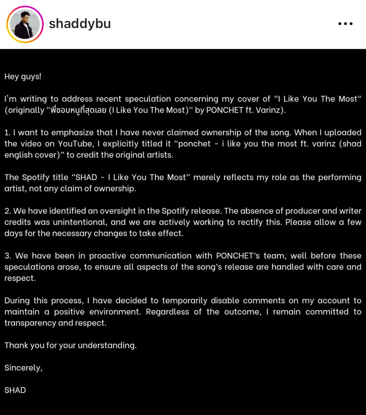 ชื่อเพลงบน Spotify "SHAD I Like You The Most" เพียงแค่สะท้อนบทบาทของผมในฐานะผู้ร้องเพลง ไม่ได้หมายความว่าผมเป็นเจ้าของเพลง
