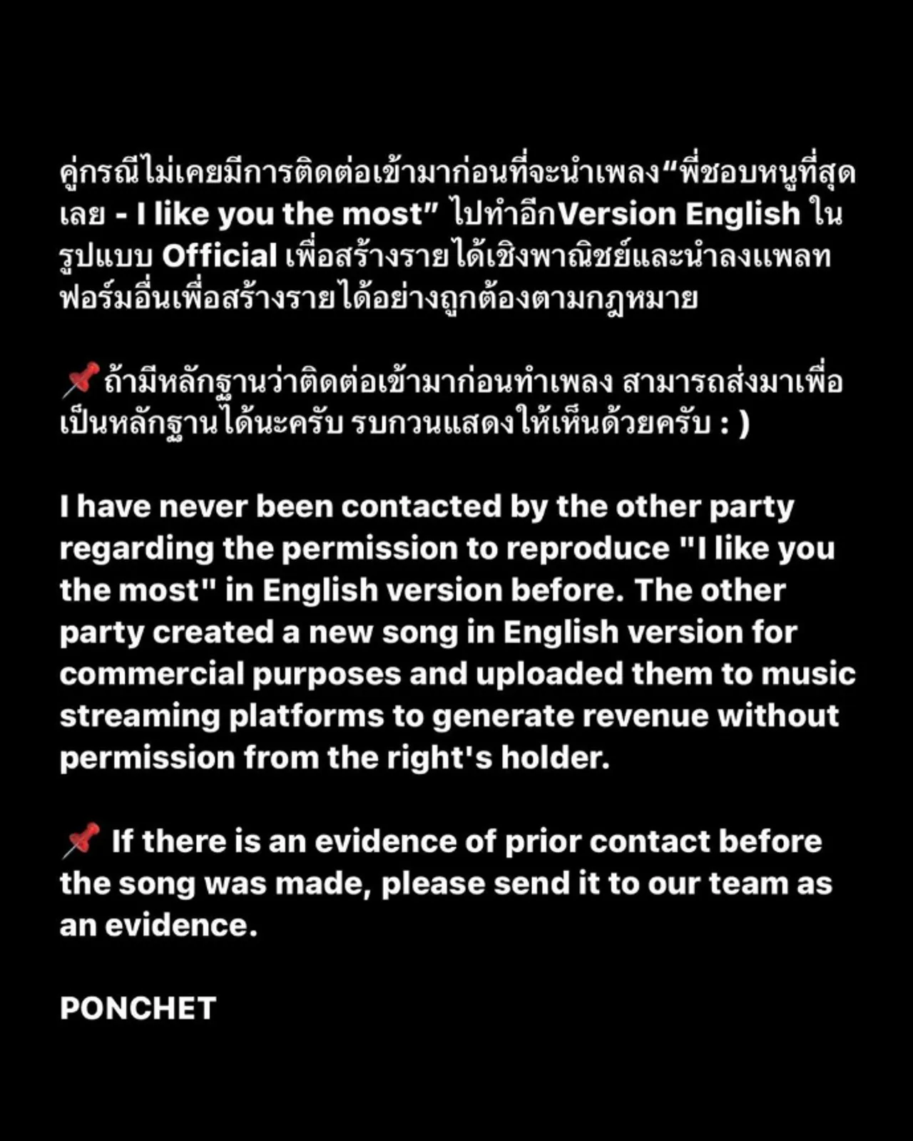 “คู่กรณีไม่เคยมีการติดต่อเข้ามาก่อนที่จะนำเพลง “พี่ชอบหนูที่สุดเลย - I like you the most” ไปทำอีก Version English ในรูปแบบ Official เพื่อสร้างรายได้เชิงพาณิชย์และนำลงแพลตฟอร์มอื่นเพื่อสร้างรายได้อย่างถูกต้องตามกฎหมาย