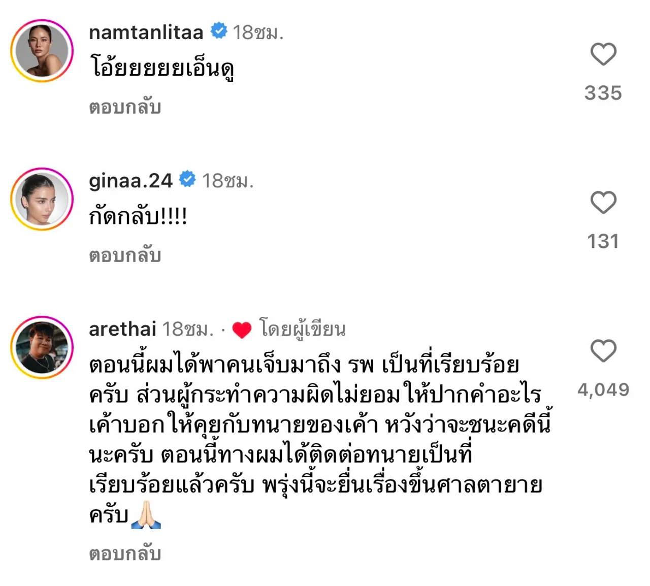 งานนี้หวานใจรุ่นน้อง อาไท กลมกิ๊ก ก็ได้เข้ามาคอมเมนต์แจ้งข่าวให้ทุกคนที่เป็นห่วงน้ำเพชรทราบว่า "ตอนนี้ผมได้พาคนเจ็บมาถึง รพ. เป็นที่เรียบร้อยครับ ส่วนผู้กระทำความผิดไม่ยอมให้ปากคำอะไร เค้าบอกให้คุยกับทนายของเค้า หวังว่าจะชนะคดีนี้นะครับ ตอนนี้ทางผมได้ติดต่อทนายเป็นที่เรียบร้อยแล้วครับ พรุ่งนี้จะยื่นเรื่องขึ้นศาลตายายครับ"