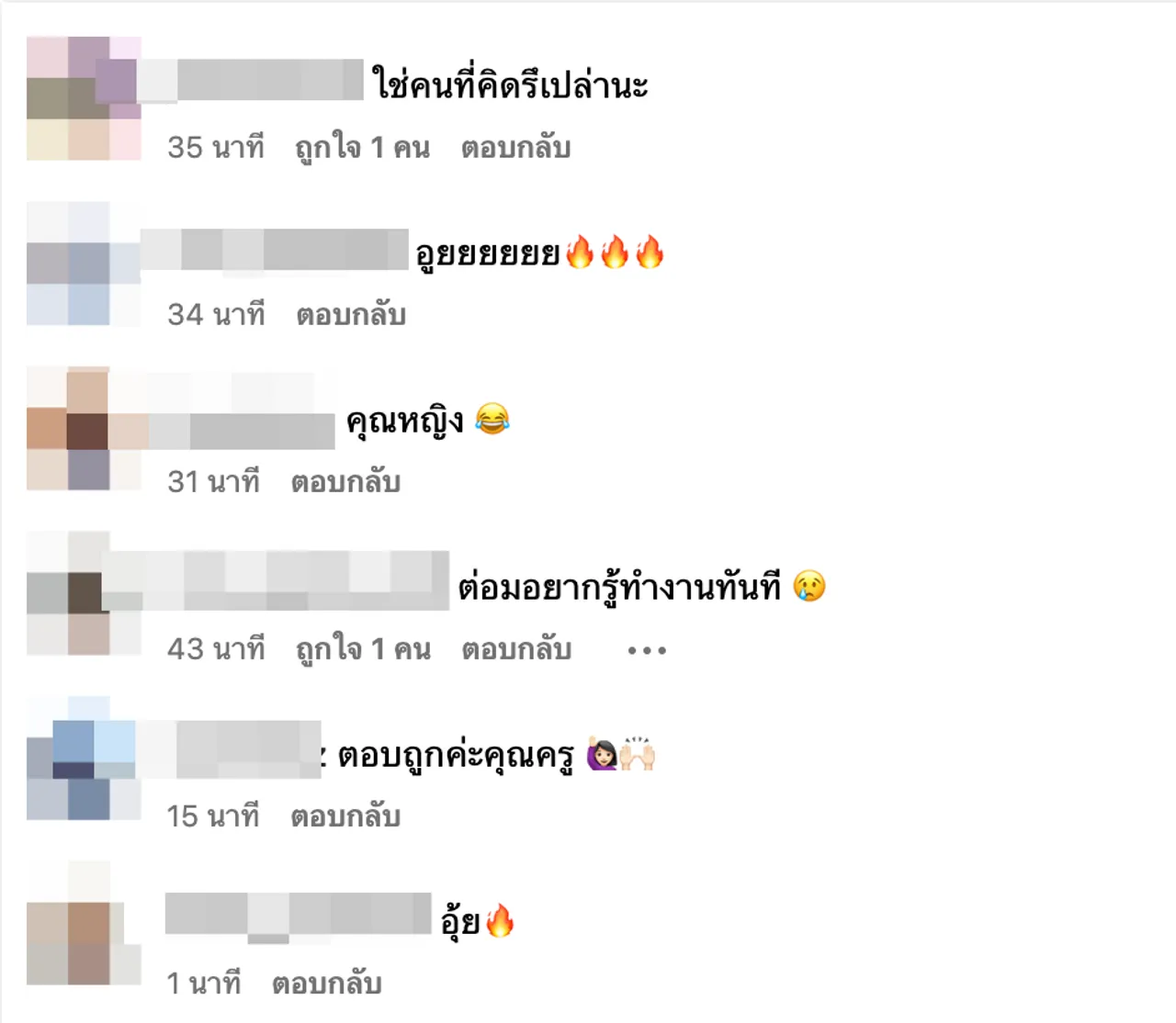 งานนี้ก็มีคนเข้าไปคอมเมนต์แสดงความคิดเห็นมากมายว่า "ใช่คนที่คิดรึเปล่านะ, อูยยยยยยยย, ต่อมอยากรู้ทำงานทันที, คุณหญิง, ตอบถูกค่ะคุณครู, ยังไงนะแม่"