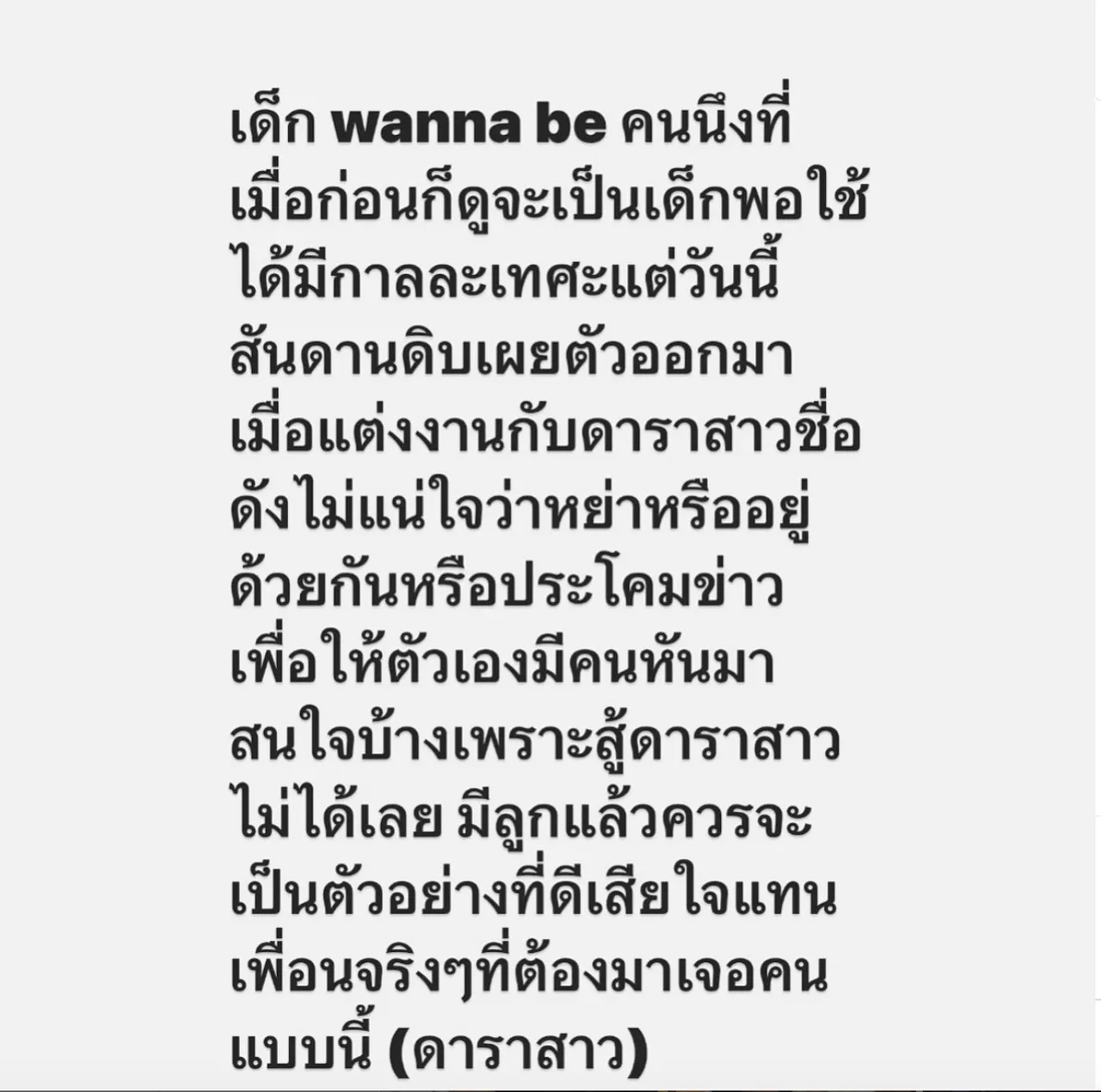"เด็ก wanna be คนนึงที่เมื่อก่อนก็ดูจะเป็นเด็กพอใช้ได้มีกาลเทศะ แต่วันนี้สันดานดิบเผยตัวออกมาเมื่อแต่งงานกับดาราสาวชื่อดังไม่แน่ใจว่าหย่า หรืออยู่ด้วยกัน หรือประโคมข่าวเพื่อให้ตัวเองมีคนหันมาสนใจบ้าง เพราะสู้ดาราสาวไม่ได้เลย มีลูกแล้วควรจะเป็นตัวอย่างที่ดีเสียใจแทนเพื่อนจริงๆ ที่ต้องมาเจอคนแบบนี้ (ดาราสาว)"