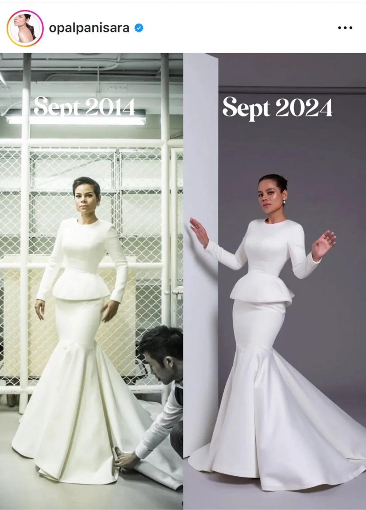 ล่าสุด โอปอล์ ได้เผยภาพตัวเองในชุดแต่งงานที่เคยใส่ในงานแต่งงานเมื่อ 10 ปีก่อนมาใส่อีกครั้ง บอกเลยว่า คุณแม่ลูก 2 หุ่นยังเป๊ะสุดๆ และสวยขึ้นกว่าเดิมอีกด้วย โดยเจ้าตัวได้โพสต์ภาพพร้อมเขียนข้อความว่า