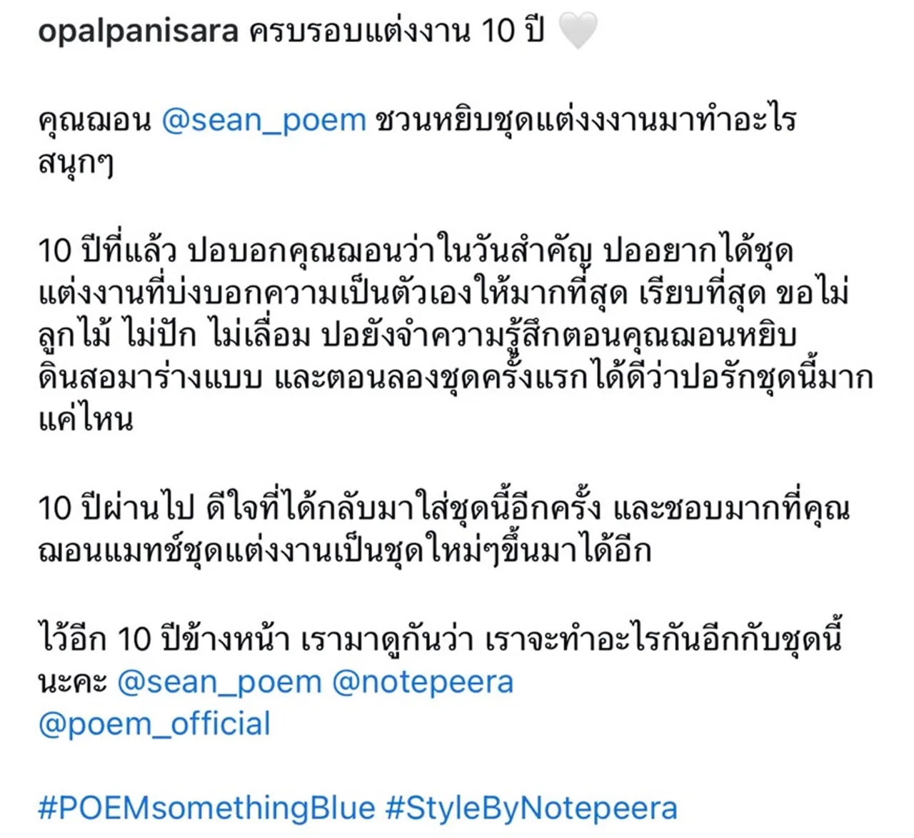 10 ปีผ่านไป ดีใจที่ได้กลับมาใส่ชุดนี้อีกครั้ง และชอบมากที่คุณฌอนแมตช์ชุดแต่งงานเป็นชุดใหม่ๆ ขึ้นมาได้อีก ไว้อีก 10 ปีข้างหน้า เรามาดูกันว่า เราจะทำอะไรกันอีกกับชุดนี้นะคะ"