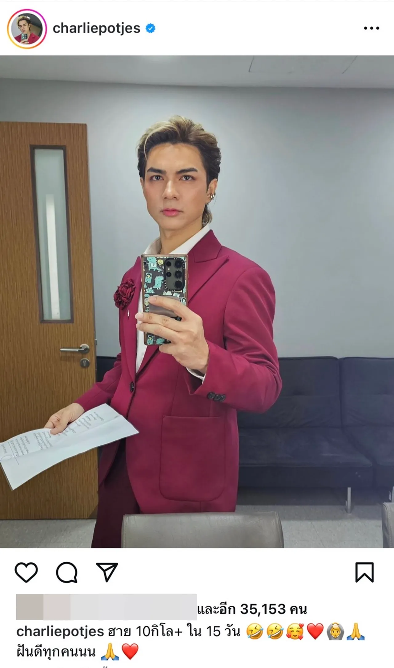 ล่าสุด แน็ก ชาลี ได้โพสต์ภาพตัวเองที่เซลฟี่หน้ากระจกสุดเท่ พร้อมเขียนแคปชั่นว่า "ฮาย 10 กิโล+ ใน 15 วัน ฝันดีทุกคนนน"