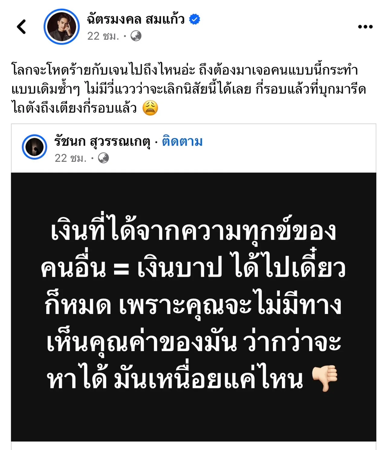 อีกทั้งยังคอมเมนต์ใต้โพสต์ต่อว่า "แล้วก็ทำเป็นไม่มีอะไรเกิดขึ้น ทำเฉย แล้วก็เอาใหม่อีก วนลูปนรก"