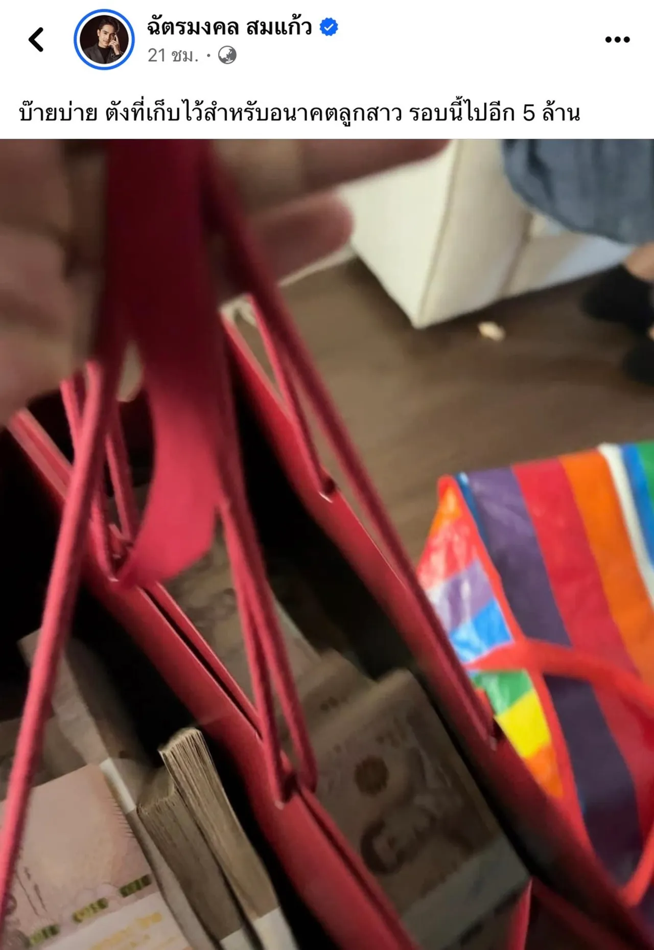 ต่อมาหนุ่ม ยิว ยังได้โพสต์เพิ่มอีก เป็นภาพเงินปึกใหญ่ทั้งหมด 5 ล้านบาท พร้อมแนบแคปชั่นว่า "บ๊ายบาย ตังที่เก็บไว้สำหรับอนาคตลูกสาว รอบนี้ไปอีก 5 ล้าน"