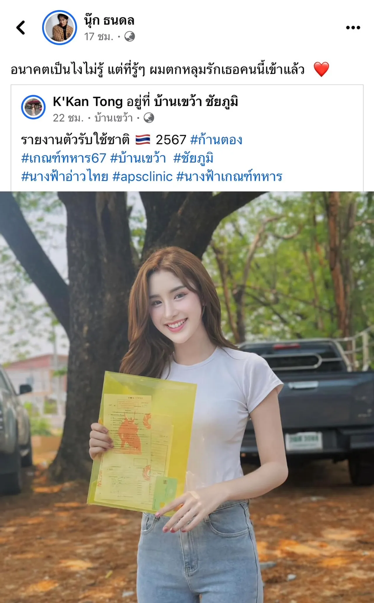 บอกเลยว่าความสวยไม่ธรรมดา ทำเอาโลกโซเชียลยกให้เป็นนางฟ้าเกณฑ์ทหาร หลายคนต่างชื่นชมความสวยน่ารัก พร้อมแห่แชร์แห่เปิดวาร์ป รวมทั้ง นักร้องหนุ่ม นุ๊ก ธนดล ก็เป็นอีกคนที่ได้เเชร์โพสต์ของน้องก้านตอง พร้อมเขียนเเคปชั่นว่า "อนาคตเป็นไงไม่รู้ แต่ที่รู้ๆ ผมตกหลุมรักเธอคนนี้เข้าแล้ว"