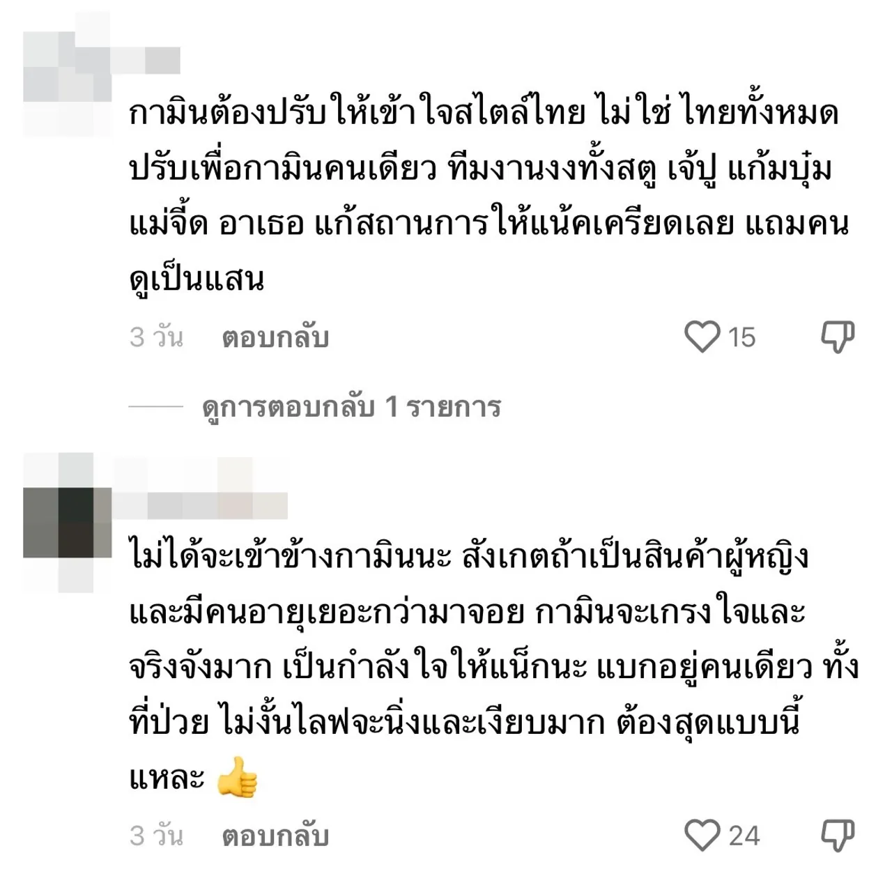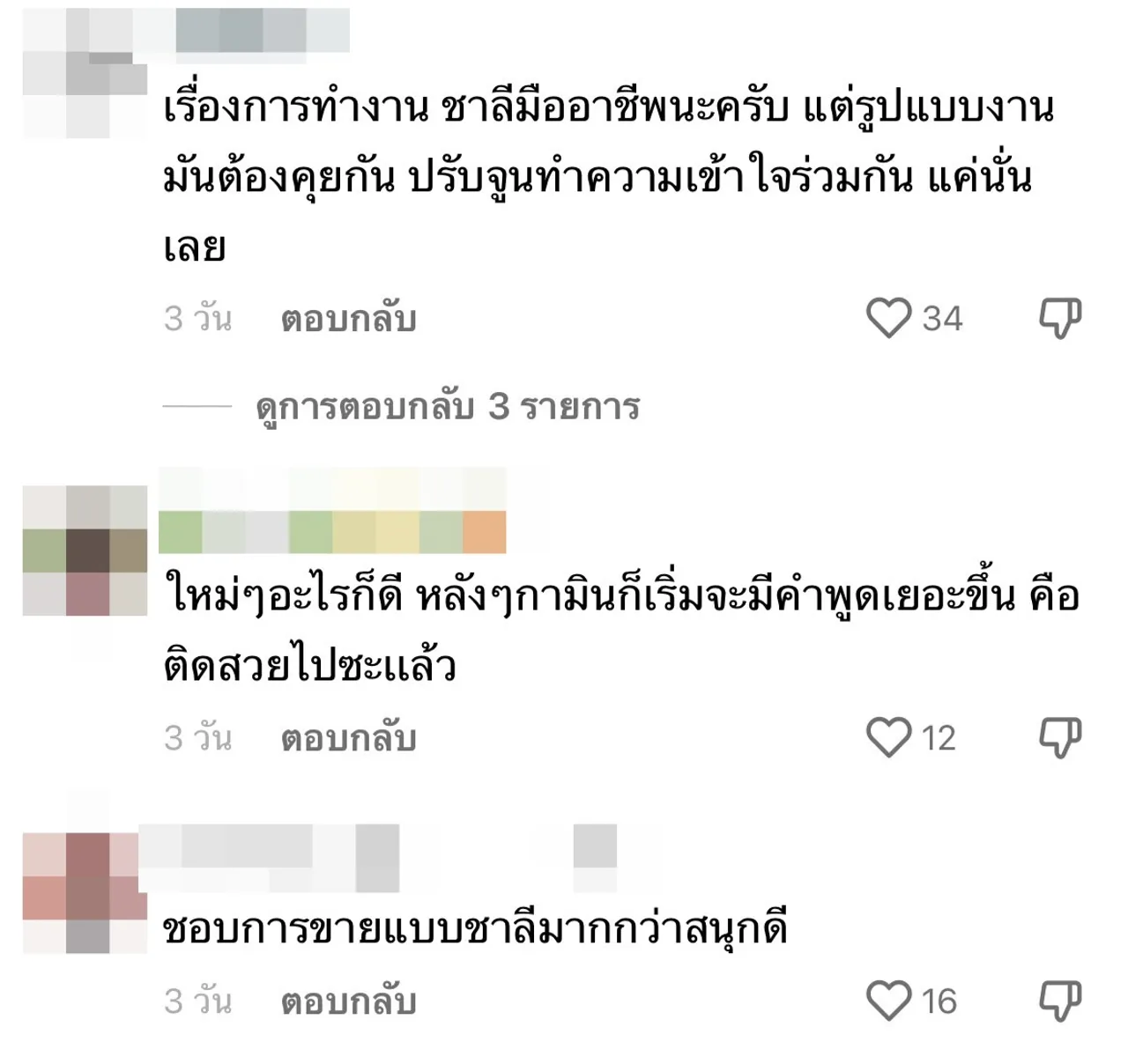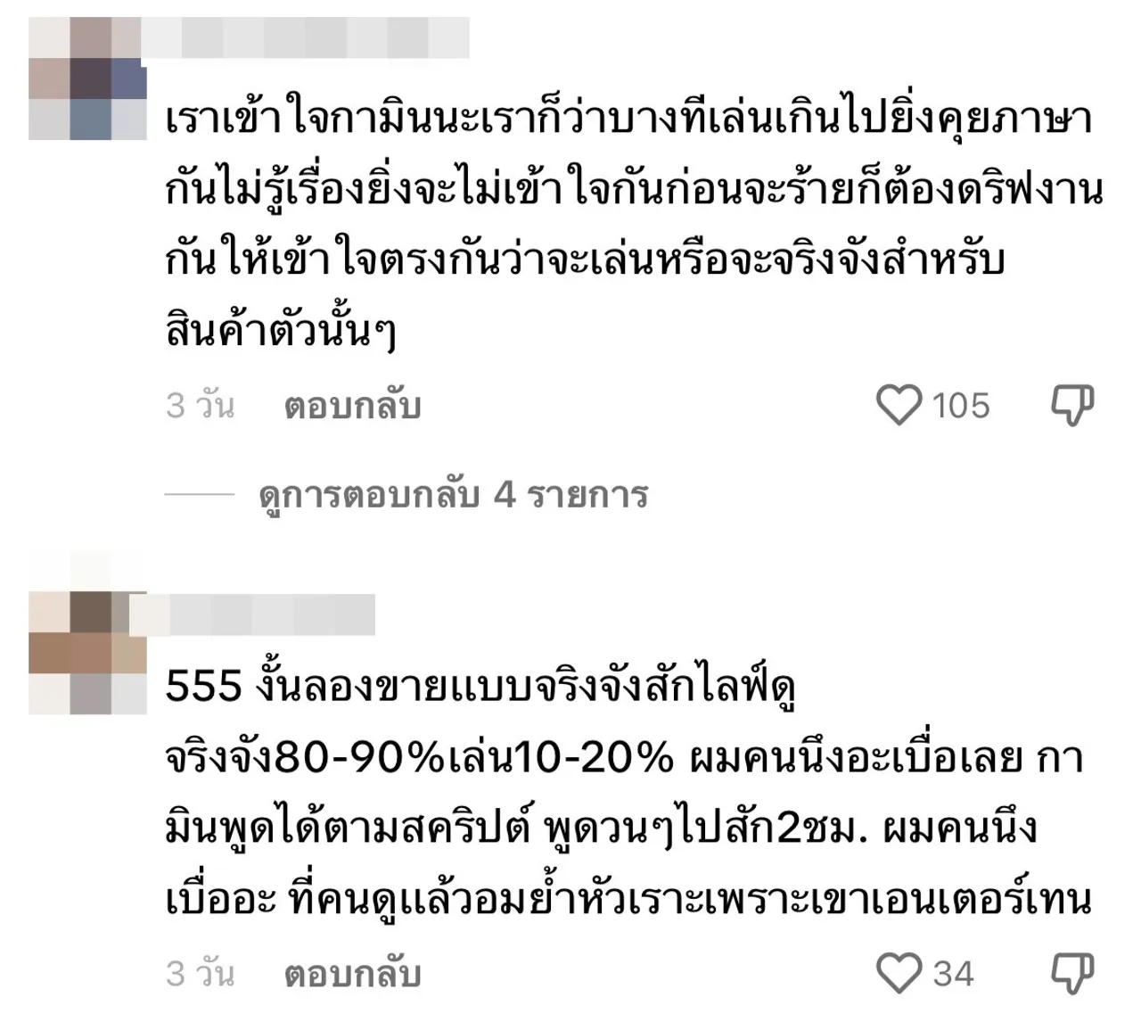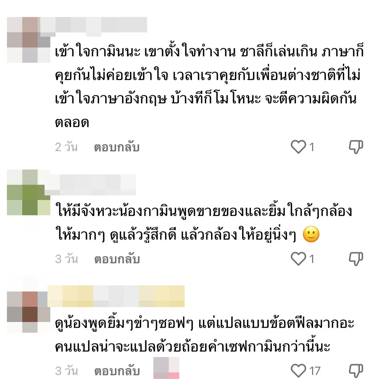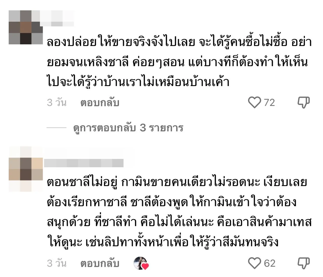 "คือบางจังหวะ กามินกำลังขาย ชาลีก็เล่นเกินไป ต้องแยกช่วงนิดนึง, กามินต้องใช้ความอดทนสูงมาก, ต้องค่อยๆ เรียนรู้และปรับกันไปเนอะ, ลองปล่อยให้ขายจริงจังไปเลย จะได้รู้คนซื้อไม่ซื้อ อย่ายอมจนเหลิงชาลี ค่อยๆ สอน แต่บางทีก็ต้องทำให้เห็นไปจะได้รู้ว่าบ้านเราไม่เหมือนบ้านเค้า,