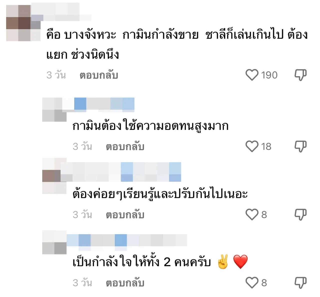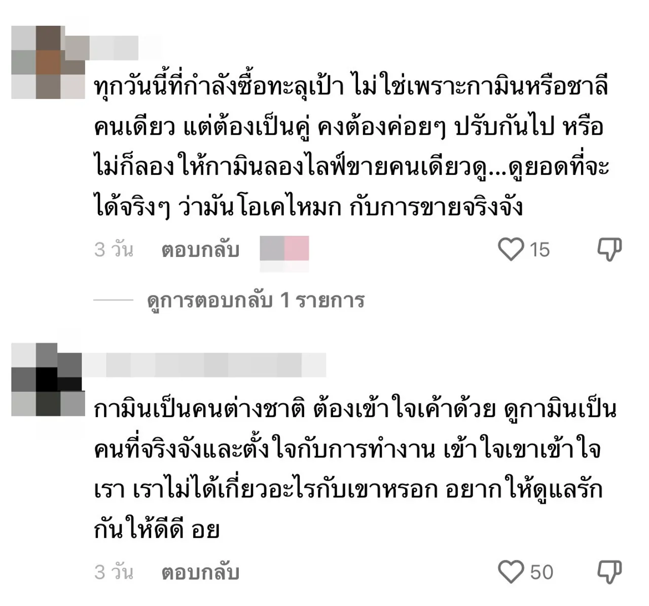 กามินเป็นคนต่างชาติ ต้องเข้าใจเค้าด้วย ดูกามินเป็นคนที่จริงจังและตั้งใจกับการทำงาน เข้าใจเขาเข้าใจเรา เราไม่ได้เกี่ยวอะไรกับเขาหรอก อยากให้ดูรักกันให้ดีๆ, เรื่องการทำงาน ชาลีมืออาชีพนะครับ แต่รูปแบบงานมันต้องคุยกัน ปรับจูนทำความเข้าใจร่วมกัน แค่นั้นเลย"