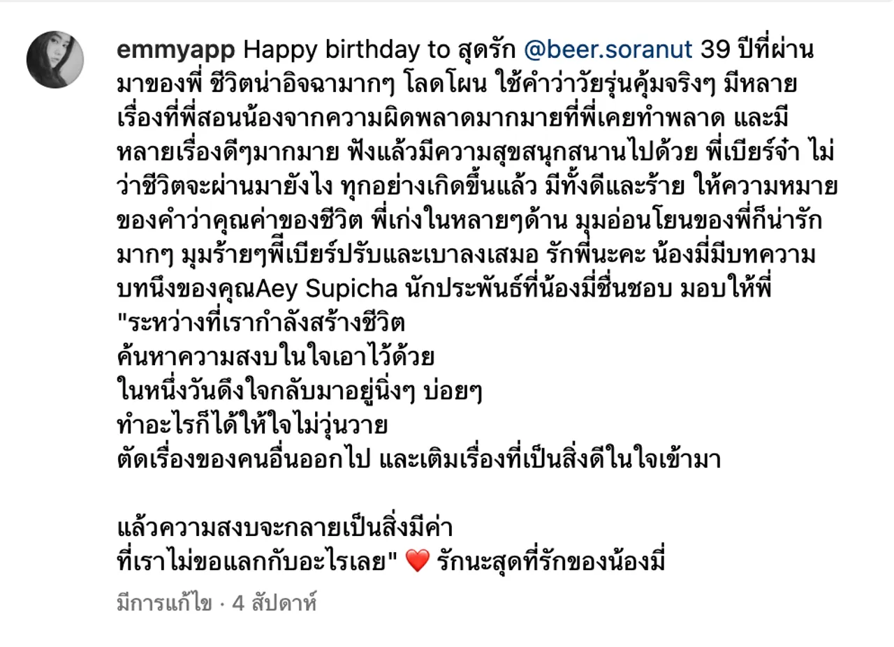 และเมื่อย้อนโพสต์ต่างๆ ของเอมมี่ จึงได้พับกับโพสต์ที่เจ้าตัวได้เขียนอวยพรวันเกิด เบียร์ ที่เพิ่งจะอายุครบ 39 ปีไปเมื่อวันที่ 7 มีนาคมที่ผ่านมา ซึ่งมีข้อความดังนี้