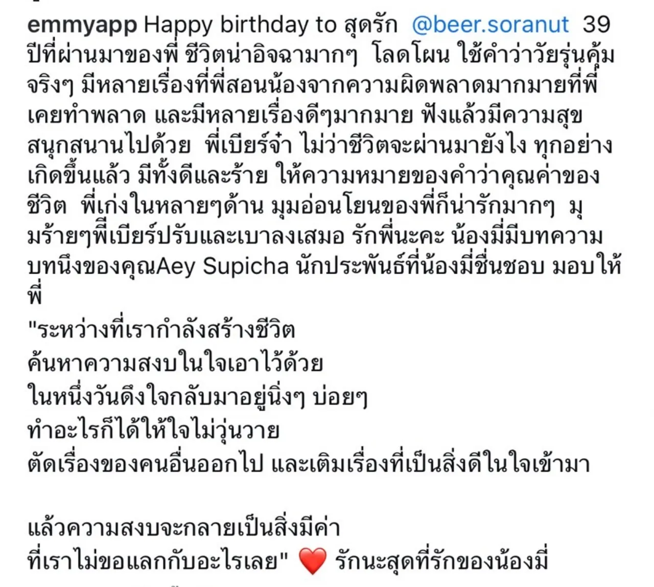 "Happy birthday to สุดรัก @beer.soranut 39 ปีที่ผ่านมาของพี่ ชีวิตน่าอิจฉามากๆ โลดโผน ใช้คำว่าวัยรุ่นคุ้มจริงๆ มีหลายเรื่องที่พี่สอนน้องจากความผิดพลาดมากมายที่พี่เคยทำพลาด และมีหลายเรื่องดีๆมากมาย ฟังแล้วมีความสุขสนุกสนานไปด้วย พี่เบียร์จ๋า ไม่ว่าชีวิตจะผ่านมายังไง ทุกอย่างเกิดขึ้นแล้ว มีทั้งดีและร้าย ให้ความหมายของคำว่าคุณค่าของชีวิต พี่เก่งในหลายๆด้าน มุมอ่อนโยนของพี่ก็น่ารักมากๆ มุมร้ายๆพี่เบียร์ปรับและเบาลงเสมอ รักพี่นะคะ น้องมี่มีบทความบทนึงของคุณAey Supicha นักประพันธ์ที่น้องมี่ชื่นชอบ มอบให้พี่