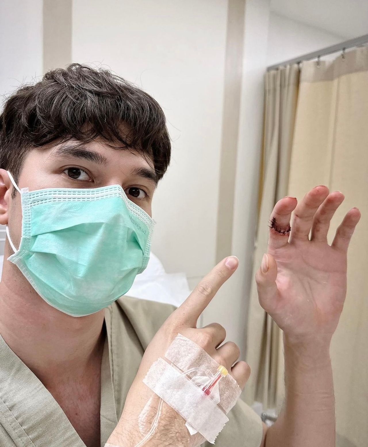 พร้อมเขียนข้อความระบุว่า "ปอกผลไม้เป็นเหตุ อุบัติเหตุมีดบาดลึกครับ เส้นเอ็นที่นิ้ว ขาด 2 เส้น เมื่อคืนได้เข้ารับการผ่าตัดต่อเส้นเอ็นเรียบร้อยแล้วครับ ขอบคุณทุกคนที่เป็นห่วงนะครับ"