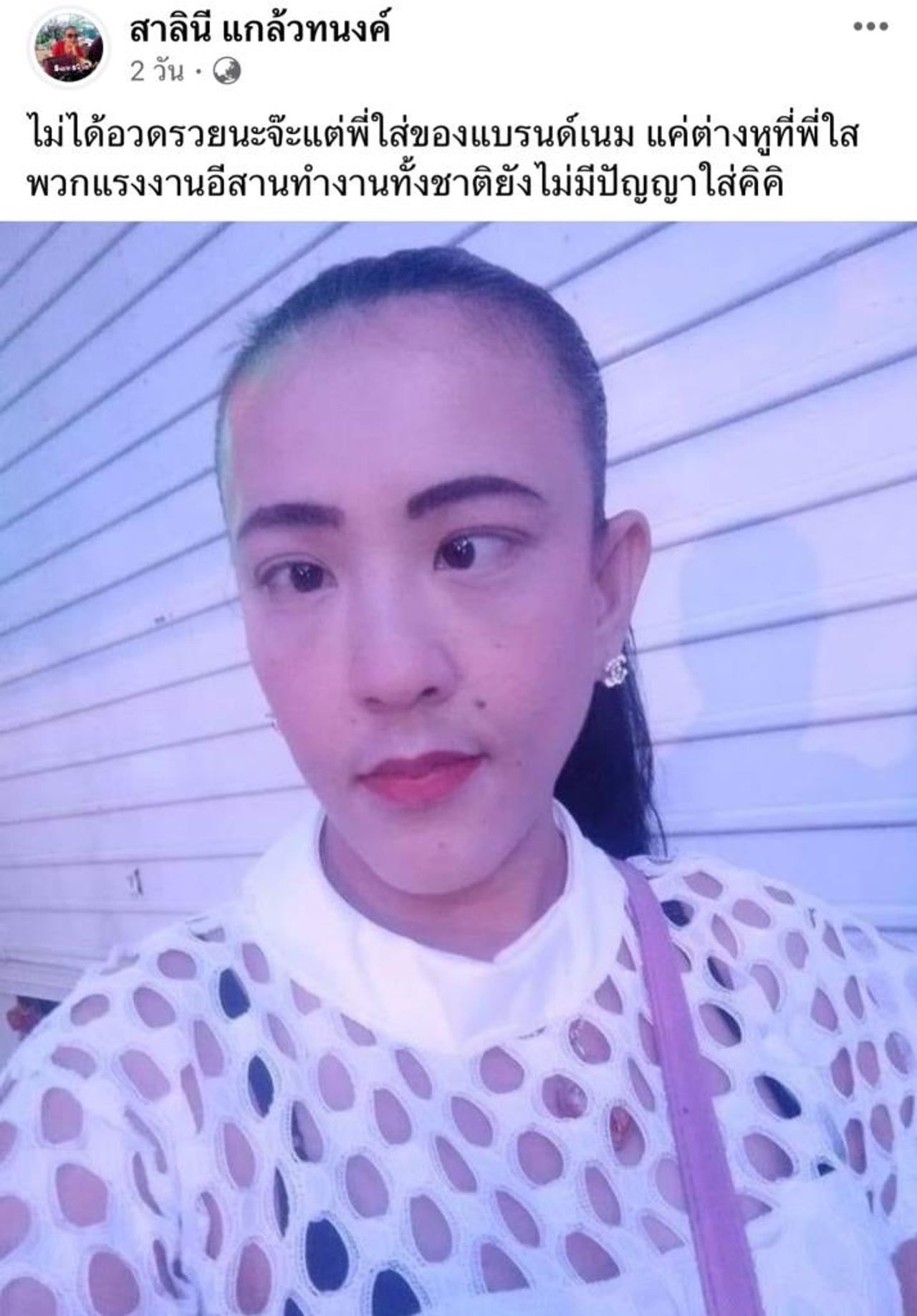 “ไม่ได้อวดรวยนะจ๊ะแต่พี่ใส่ของแบรนด์เนม แค่ต่างหูที่พี่ใส่พวกแรงงานอีสานทำงานทั้งชาติยังไม่มีปัญญาใส่ คิคิ คนอีสานที่ด่าพี่อย่าให้พี่เจอนะจ๊ะ"