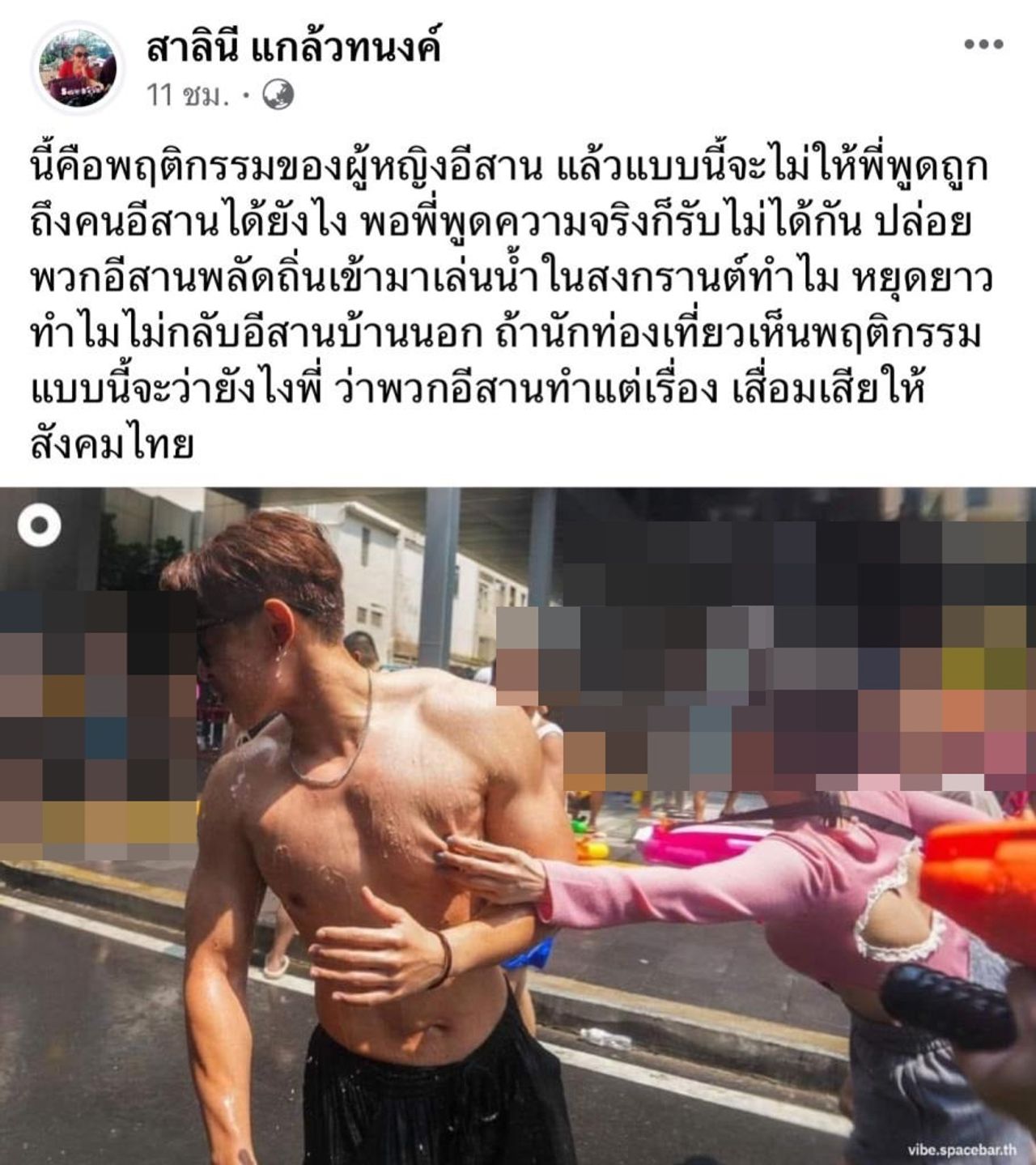 "นี่คือพฤติกรรมของผู้หญิงอีสาน แล้วแบบนี้จะไม่ให้พี่พูดถูกถึงคนอีสานได้ยังไง พอพี่พูดความจริงก็รับไม่ได้กัน ปล่อยพวกอีสานพลัดถิ่นเข้ามาเล่นน้ำในสงกรานต์ทำไม หยุดยาวทำไมไม่กลับอีสานบ้านนอก ถ้านักท่องเที่ยวเห็นพฤติกรรมแบบนี้จะว่ายังไง พี่ว่าพวกอีสานทำแต่เรื่องเสื่อมเสียให้สังคมไทย"