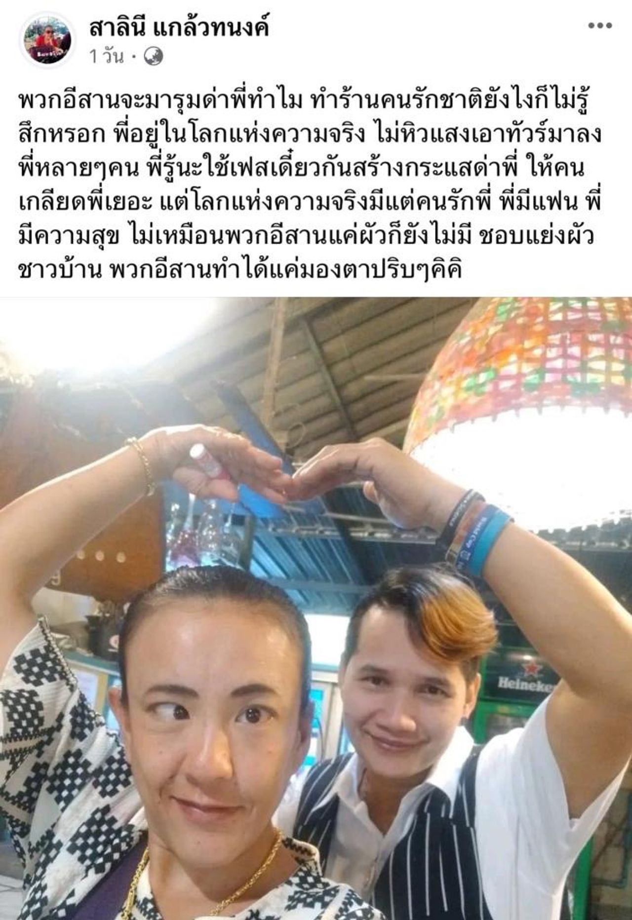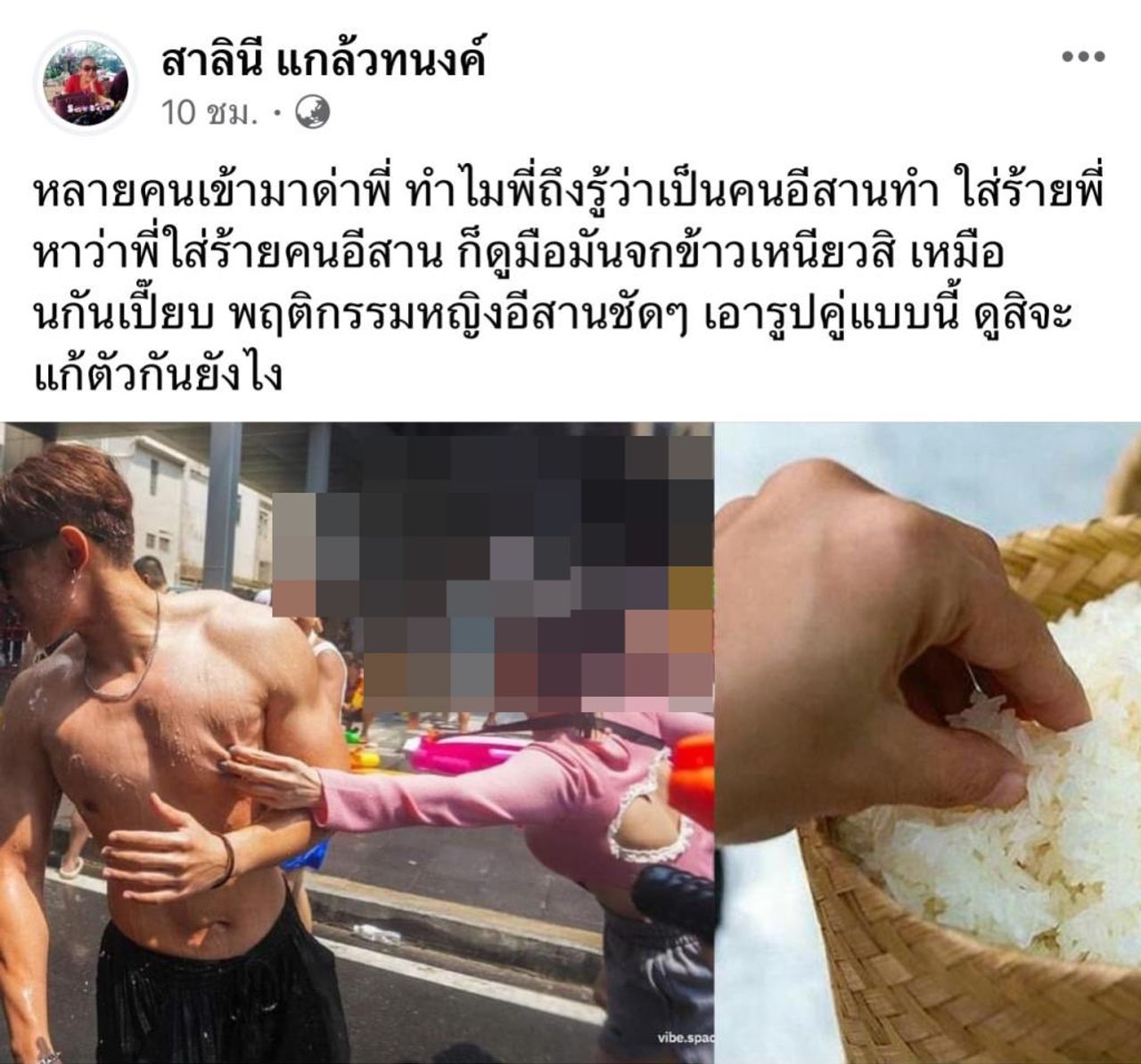 "หลายคนเข้ามาด่าพี่ ทำไมพี่ถึงรู้ว่าเป็นคนอีสานทำ ใส่ร้ายพี่ หาว่าพี่ใส่ร้ายคนอีสาน ก็ดูมือมันจกข้าวเหนียวสิ เหมือนกันเปี๊ยบ พฤติกรรมหญิงอีสานชัดๆ เอารูปคู่แบบนี้ ดูสิจะแก้ตัวกันยังไง"