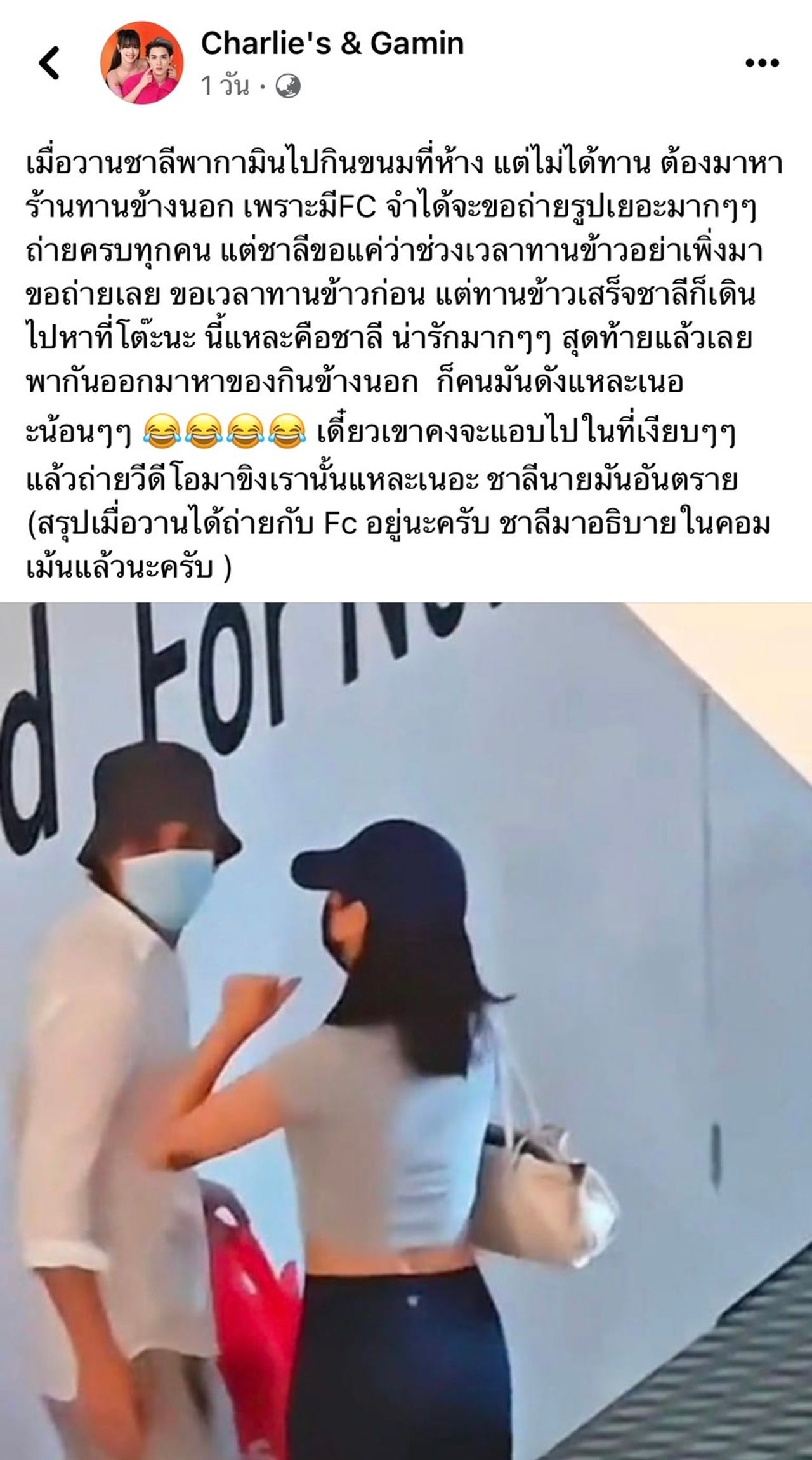 "เมื่อวานชาลีพากามินไปกินขนมที่ห้าง แต่ไม่ได้ทาน ต้องมาหาร้านทานข้างนอก เพราะมี FC จำได้ จะขอถ่ายรูปเยอะมากๆๆ ถ่ายครบทุกคน แต่ชาลีขอแค่ว่าช่วงเวลาทานข้าวอย่าเพิ่งมาขอถ่ายเลย ขอเวลาทานข้าวก่อน แต่ทานข้าวเสร็จชาลีก็เดินไปหาที่โต๊ะนะ นี้แหละคือชาลี น่ารักมากๆๆ