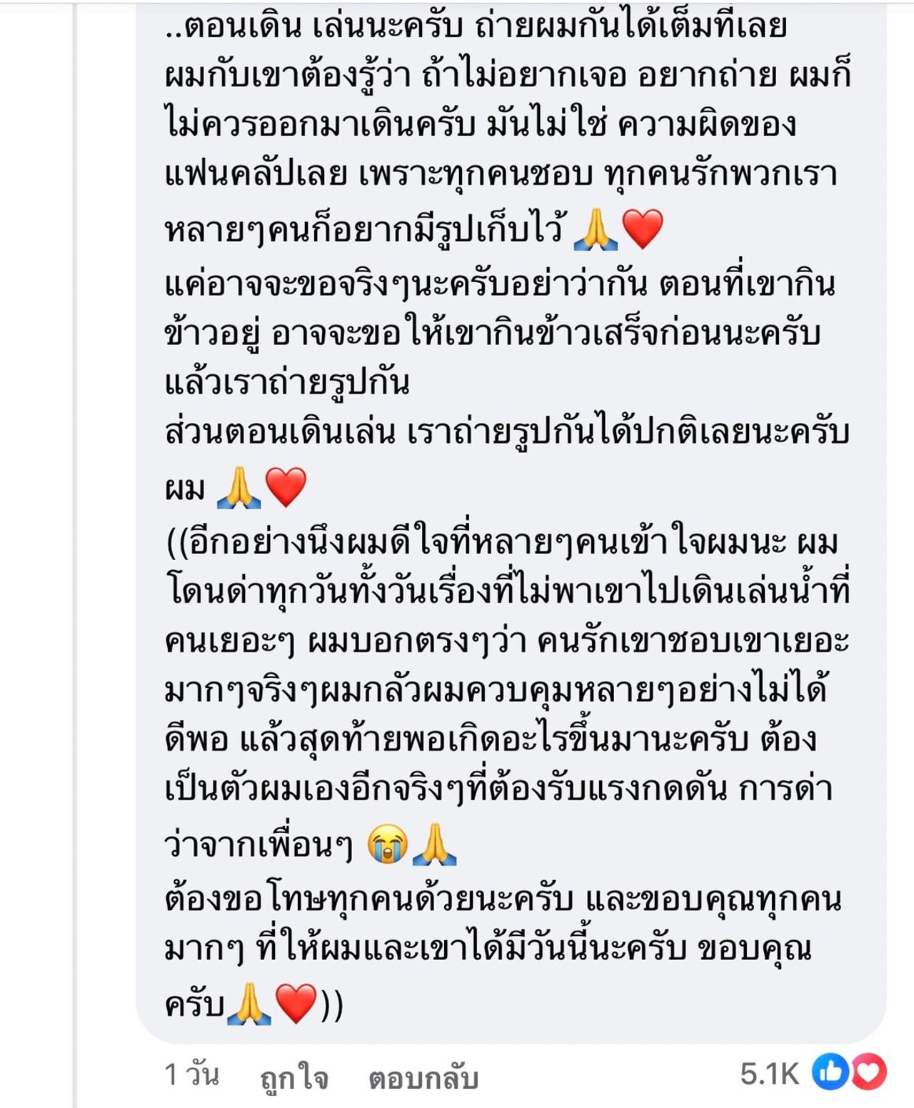((อีกอย่างนึงผมดีใจที่หลายๆ คนเข้าใจผมนะ ผมโดนด่าทุกวันทั้งวันเรื่องที่ไม่พาเขาไปเดินเล่นน้ำที่คนเยอะๆ ผมบอกตรงๆ ว่า คนรักเขาชอบเขาเยอะมากๆ จริงๆ ผมกลัวผมควบคุมหลายๆ อย่างไม่ได้ ดีพอ แล้วสุดท้ายพอเกิดอะไรขึ้นมานะครับ ต้องเป็นตัวผมเองอีกจริงๆ ที่ต้องรับแรงกดดัน การด่าว่าจากเพื่อนๆ ต้องขอโทษทุกคนด้วยนะครับ และขอบคุณทุกคนมากๆ ที่ให้ผมและเขาได้มีวันนี้นะครับ ขอบคุณครับ))"
