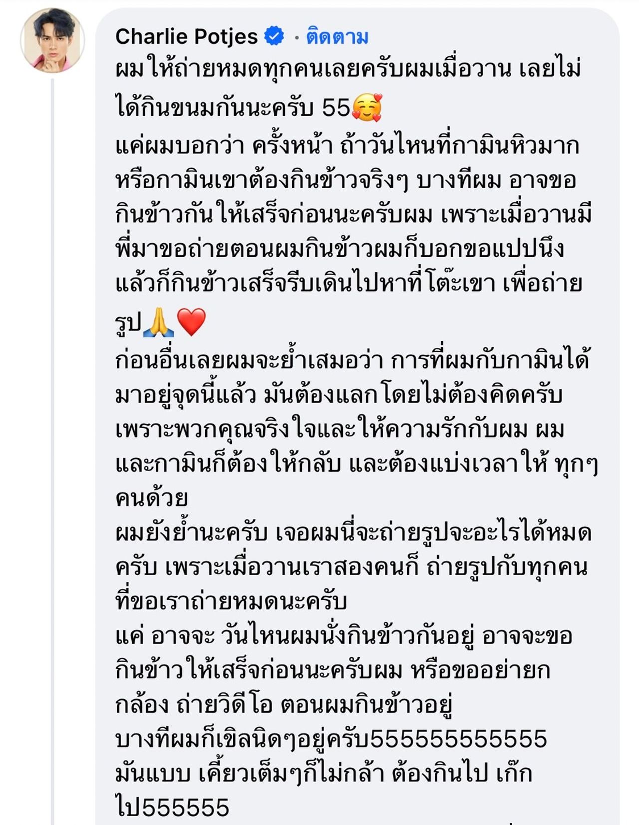 แค่อาจจะวันไหนผมนั่งกินข้าวกันอยู่ อาจจะขอกินข้าวให้เสร็จก่อนนะครับผม หรือขออย่ายกกล้อง ถ่ายวิดีโอ ตอนผมกินข้าวอยู่ บางทีผมก็เขิลนิดๆ อยู่ครับ 555555555555 มันแบบ เคี้ยวเต็มๆ ก็ไม่กล้า ต้องกินไป เก๊กไป 555555 ..ตอนเดิน เล่นนะครับ ถ่ายผมกันได้เต็มที่เลย