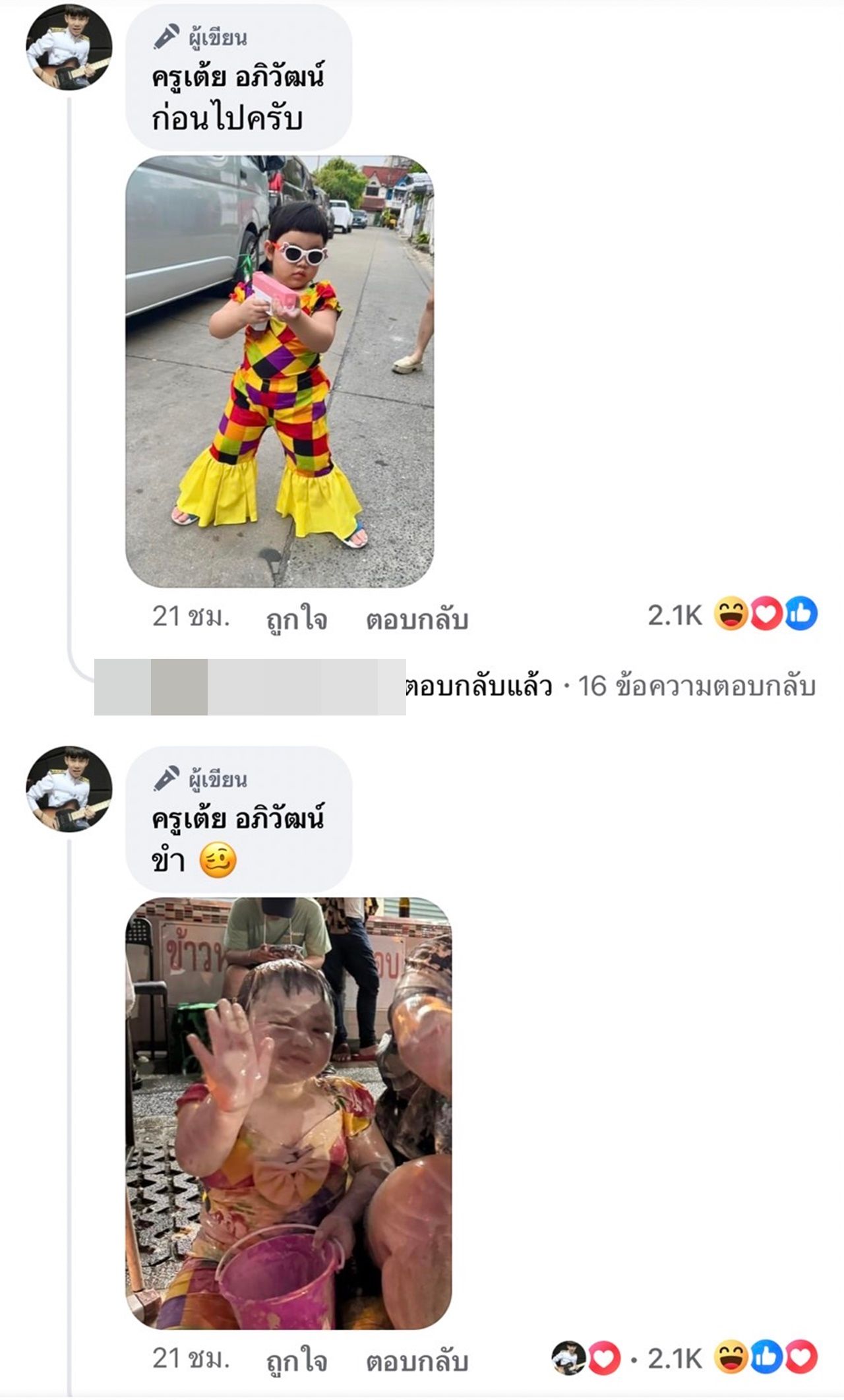 ครูเต้ย ได้เขียนแคปชั่นว่า "สงกรานต์ปีนี้ก็ไม่เท่าไหร่" และยังได้โพสต์ภาพเทียบ before & after ให้เห็นชัดๆ เป็นภาพน้องตั้งใจตอนออกจากบ้าน ชุดสวยจัดเต็มสุดๆ หลังจากที่หลายคนได้เห็นภาพดังกล่าว ได้เข้ามาคอมเมนต์ขำกันจำนวนมาก พร้อมกับแซว 2 พ่อลูกกันยกใหญ่ อาทิ เกินไป หัวหน้า, ตั้งกระทะที ต้าวใจ๋, น่ารัก เอ็นดูใจ๋, โอ้ยยใจ๋ เอ็นดูลูก, ทอดได้, เอ็นดูมากลูก5555 เป็นต้น.