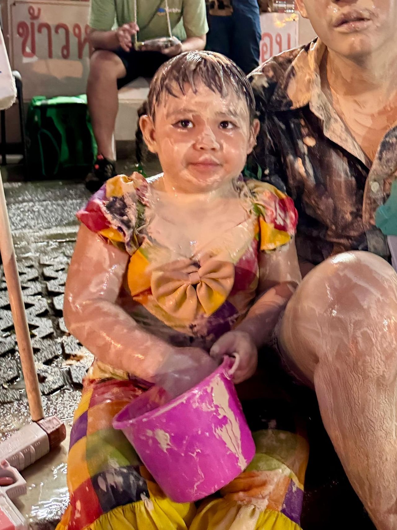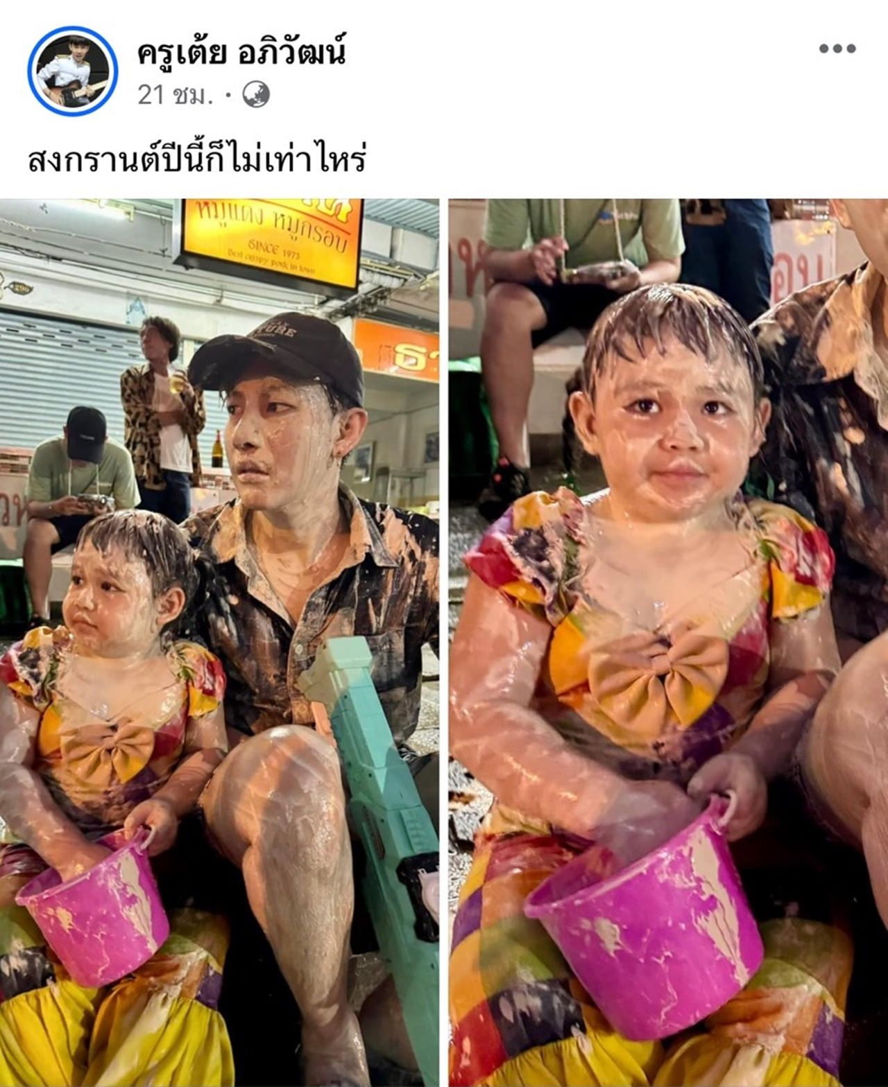 เช่นเดียวกับนักร้องหนุ่ม เต้ย อภิวัฒน์ ก็ได้พาลูกสาววัย 2 ขวบ น้องตั้งใจ ออกมาเล่นน้ำด้วยกัน แต่งานนี้ทำเอาหลายคนที่เห็นภาพทั้งขำทั้งเอ็นดู 2 พ่อลูกคู่นี้ เพราะสภาพนั้นเต็มไปด้วยแป้งและดินสอพอง ที่พร้อมเตรียมทอดในกระทะ