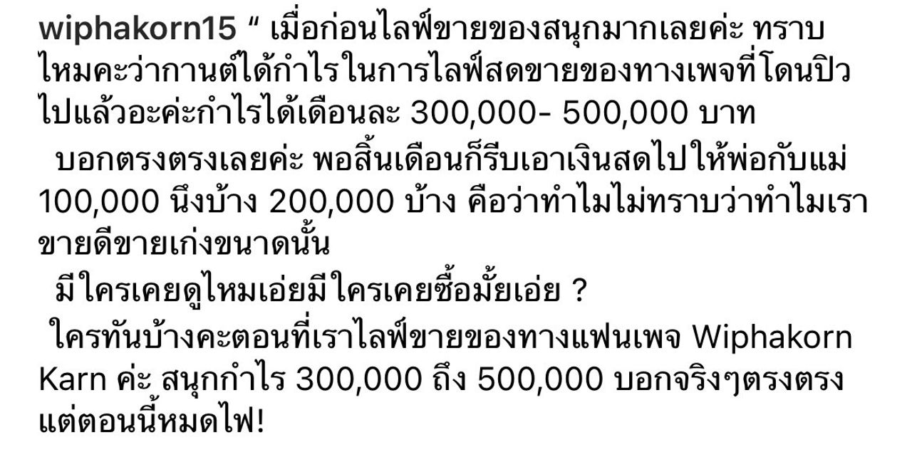 "เมื่อก่อนไลฟ์ขายของสนุกมากเลยค่ะ ทราบไหมคะว่ากานต์ได้กำไรในการไลฟ์สดขายของทางเพจที่โดนปลิวไปแล้วอะค่ะ กำไรได้เดือนละ 300,000-500,000 บาท