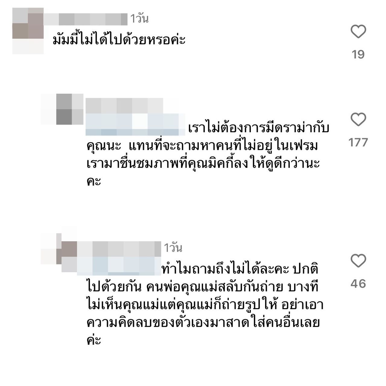 แต่ชาวเน็ตคนที่ถามคำถามดังกล่าว ก็ได้เข้ามาคอมเมนต์ถามต่อว่า "ทำไมถามถึงไม่ได้ละคะ ปกติไปด้วยกัน คนพ่อคุณแม่สลับกันถ่าย บางทีไม่เห็นคุณแม่แต่คุณแม่ก็ถ่ายรูปให้ อย่าเอาความคิดลบของตัวเองมาสาดใส่คนอื่นเลยค่ะ"