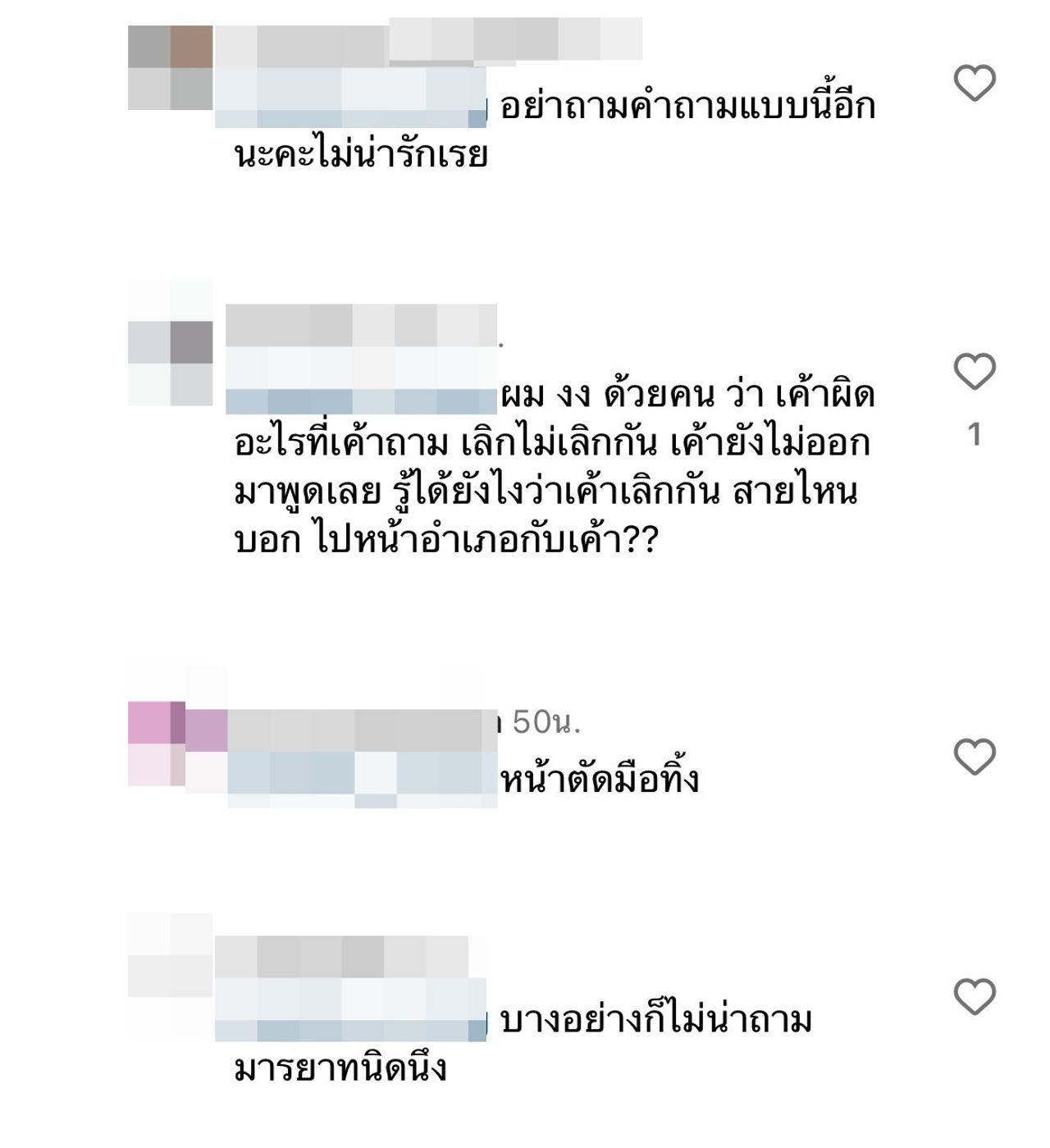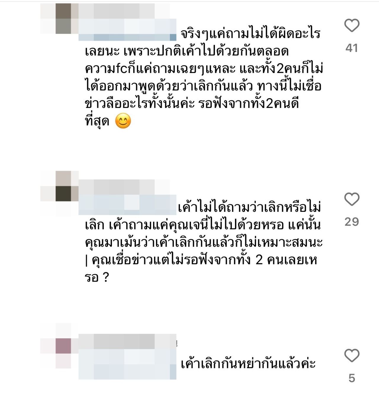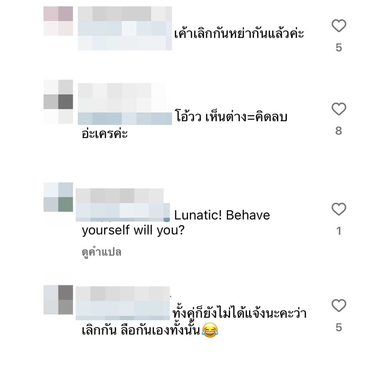 จากนั้นก็มีชาวเน็ตคนอื่นๆ เข้ามาคอมเมนต์ตอบชาวเน็ตคนแรกที่เป็นคนถามคำถามว่า "ข่าวว่าเขาเลิกกันแล้วค่ะ ด้วยมารยาทอย่าถามดีกว่านะคะ, เค้าเลิกกันหย่ากันแล้วค่ะ"