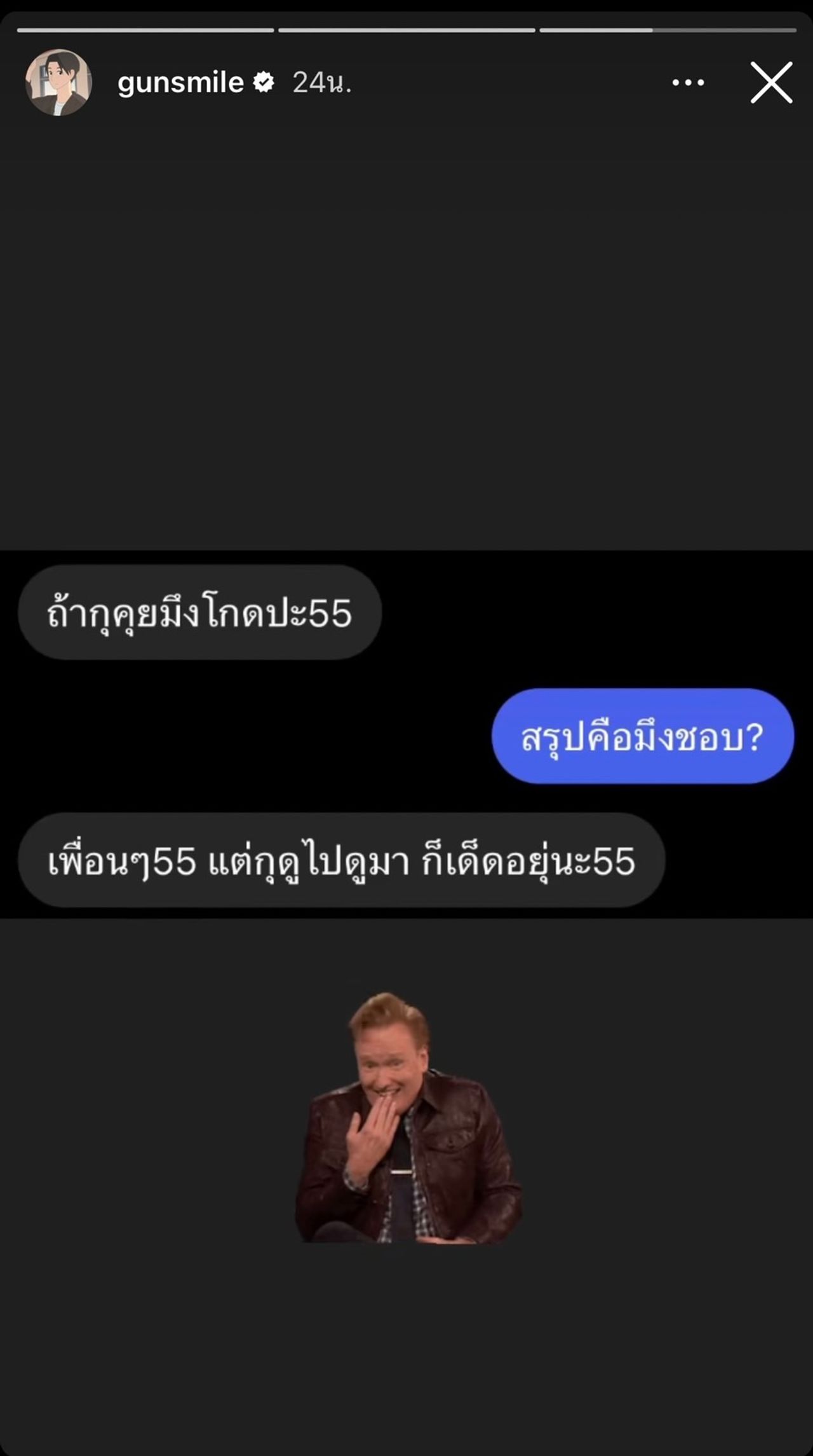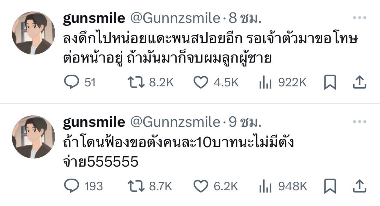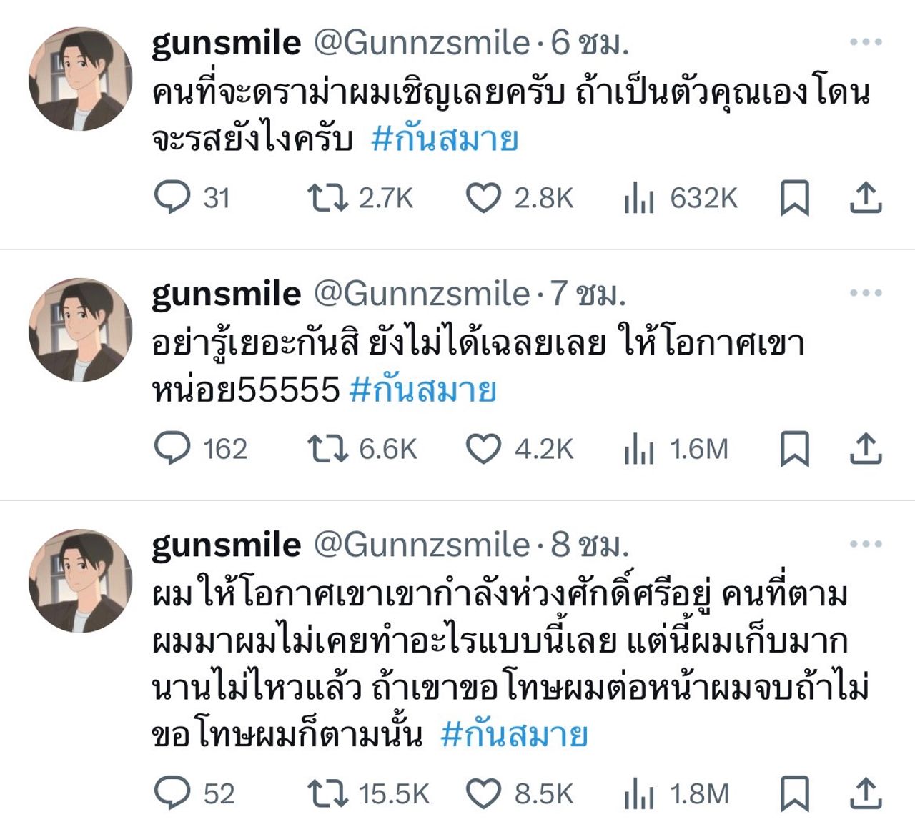 และ "ผมให้โอกาสเขา เขากำลังห่วงศักดิ์ศรีอยู่ คนที่ตามผมมา ผมไม่เคยทำอะไรแบบนี้เลย แต่นี่ผมเก็บมานานไม่ไหวแล้ว ถ้าเขาขอโทษผมต่อหน้า ผมจบ ถ้าไม่ขอโทษผมก็ตามนั้น #กันสมาย"