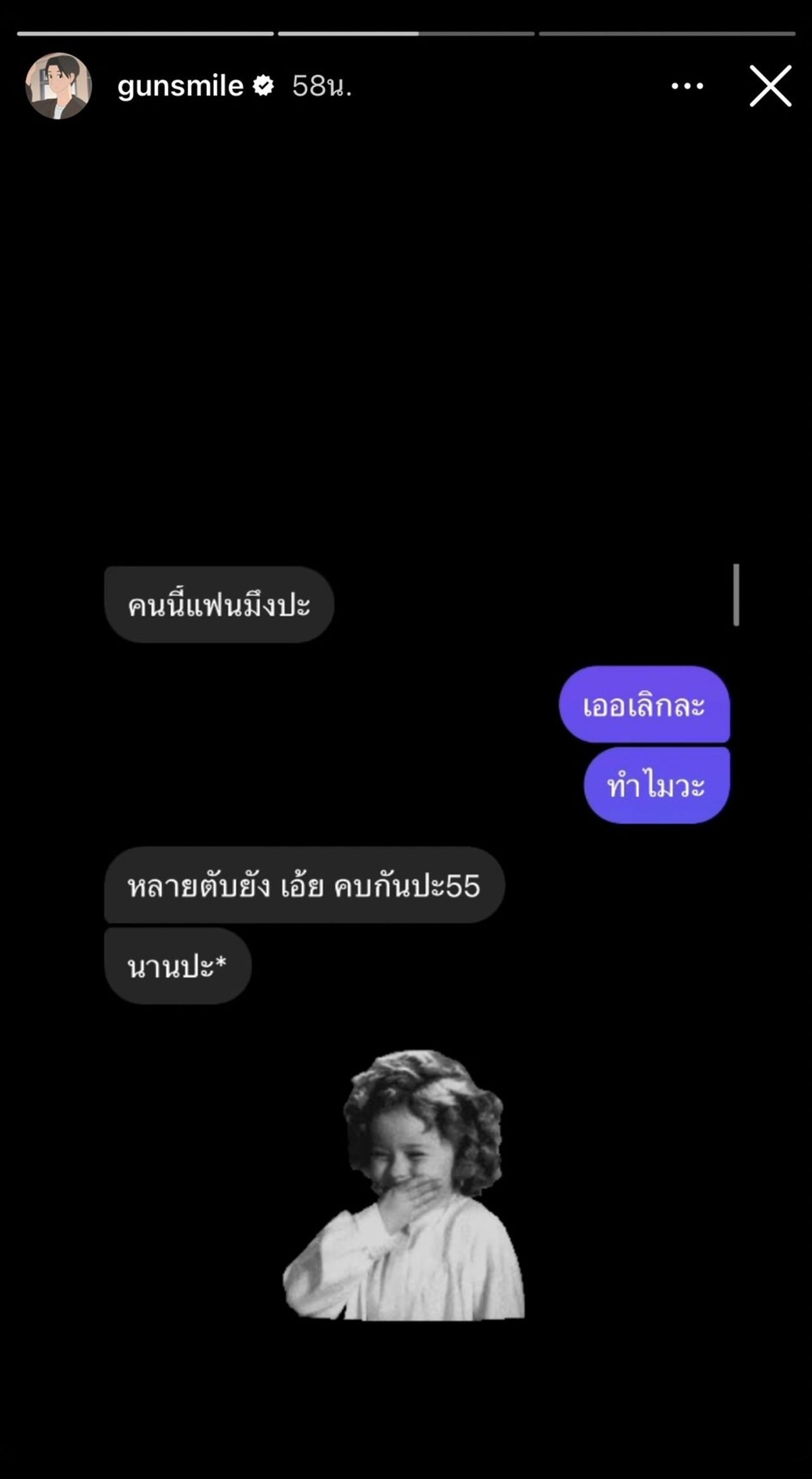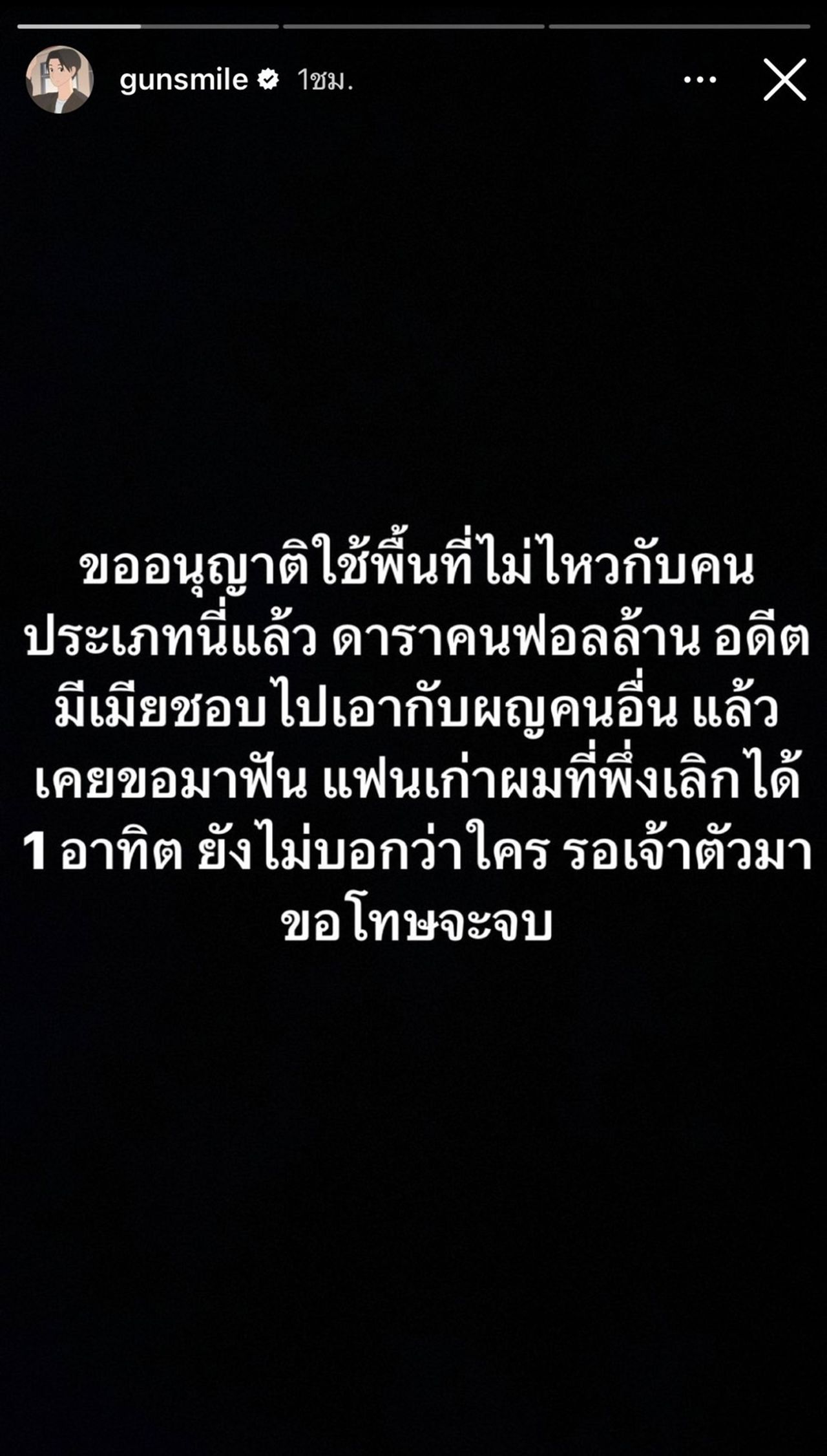 "ขออนุญาตใช้พื้นที่ไม่ไหวกับคนประเภทนี้แล้ว ดาราคนฟอลล้าน อดีตมีเมียชอบไปเอากับผญคนอื่น แล้วเคยขอมาฟันแฟนเก่าผมที่เพิ่งเลิกได้ 1 อาทิตย์ ยังไม่บอกว่าใคร รอเจ้าตัวมาขอโทษจะจบ" พร้อมทักแคปแชตที่นักแสดงหนุ่มคุยกับกันสมายออกมาแฉให้คนได้อ่านข้อความที่อีกฝ่ายพิมพ์อีกด้วย และยังคอมเมนต์บอกว่า นักแสดงหนุ่มนั้นอยู่ช่องน้อยสี