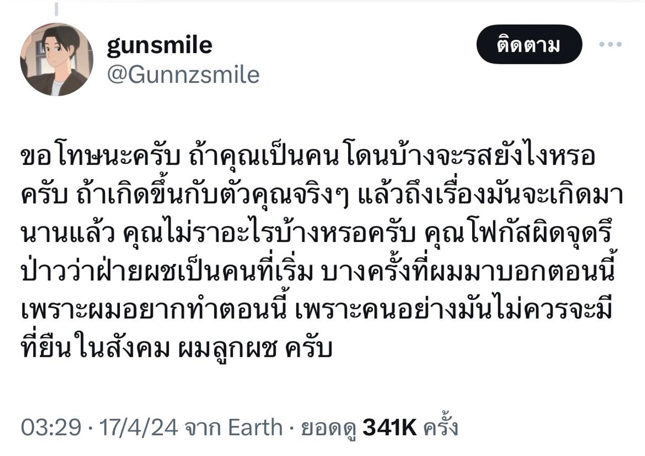 และ "ที่ผมออกมาโพสต์ ออกมาแฉ เพราะทุกวันนี้มันยังเป็นคนแบบนี้เหมือนเดิม แล้วผมต้องทำวิธีไหนหรอครับให้คนรับรู้ว่าไอ้นี่มันเป็นคนแบบนี้ ถ้าผมโพสต์เรื่องนี้ตอนเพิ่งเกิดขึ้น คุณคิดแบบนี้ก็ดราม่าผมอยู่ดี"