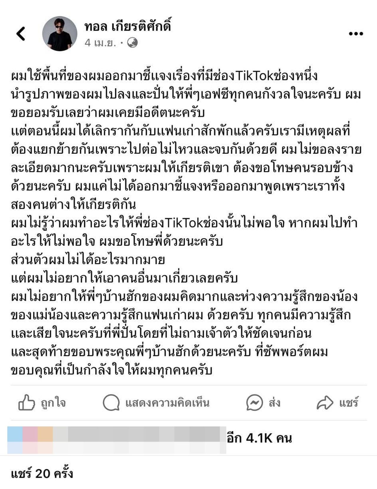 และเมื่อย้อนโพสต์ของ ทอล เกียรติศักดิ์ ในเฟซบุ๊ก ในช่วงวันที่ 4 เม.ย.ที่ผ่านมา ฝ่ายชายได้โพสต์ประกาศสถานะว่าได้เลิกรากับแฟนสาวมาสักระยะหนึ่งแล้ว แต่ไม่ขอลงรายละเอียดในการยุติความสัมพันธ์กัน ซึ่งมีข้อความดังนี้