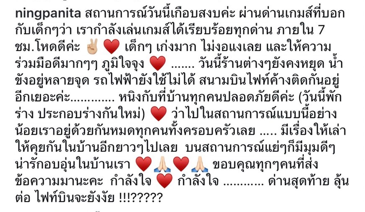 ก่อนหน้านี้ หนิง ปณิตา กลายเป็นผู้ประสบภัยทันที ขณะพาครอบครัวไปเที่ยวที่ดูไบ แต่เกิดเหตุการณ์ไม่คาดคิด ฝนตกอย่างกระหน่ำ ทำให้น้ำท่วมทะลักเข้ามาในห้างหรูกลางนครดูไบ สหรัฐอาหรับเอมิเรตส์ ทำให้ หนิง ต้องแบกกระเป๋าเดินทางหนีน้ำออกมาอย่างทุลักทุเล