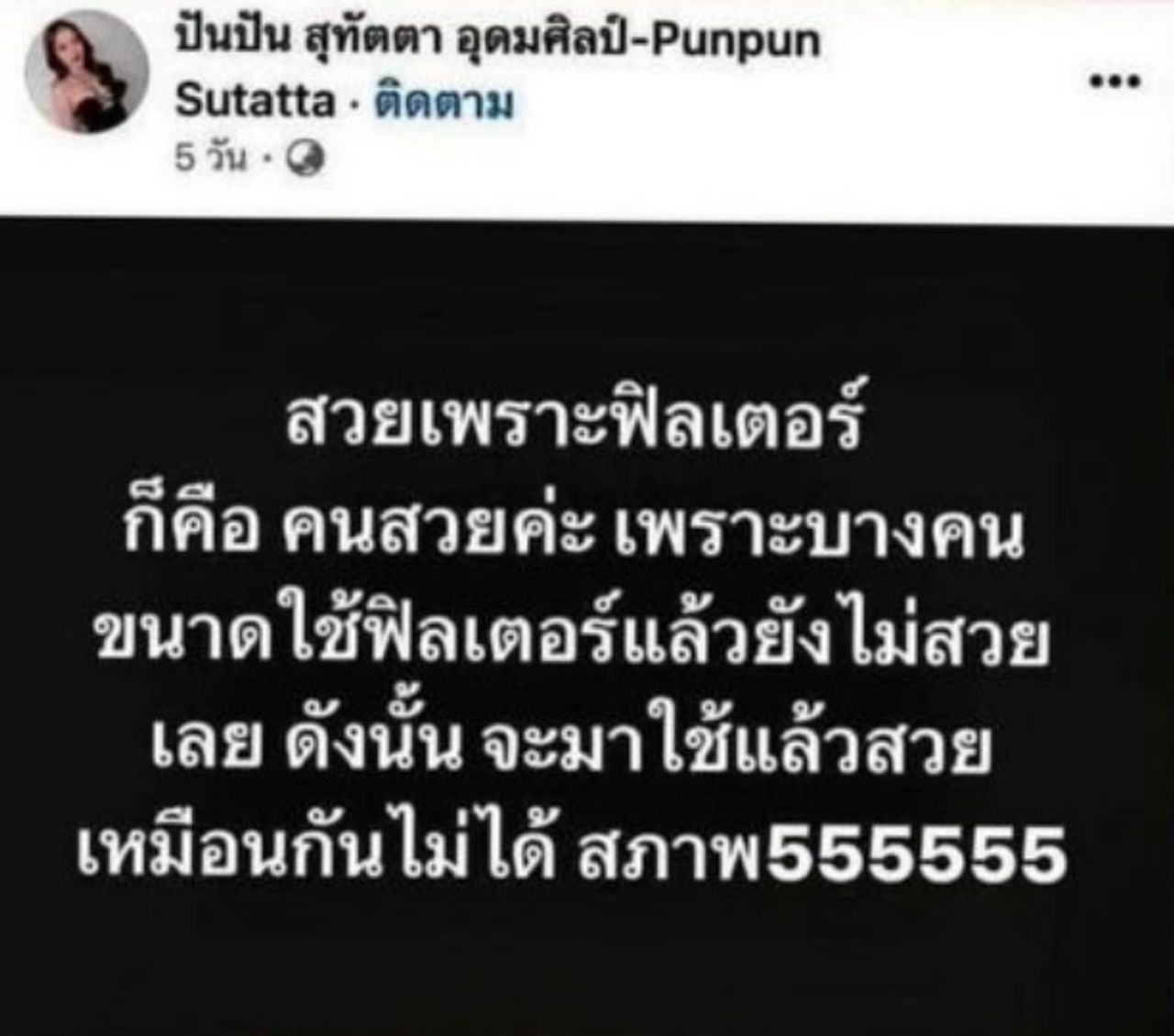 ที่ล่าสุดโดนตัดต่อนำภาพของเธอ พร้อมใส่ข้อความว่า “สวยเพราะฟิลเตอร์ก็คือคนสวยค่ะ เพราะบางคนขนาดใช้ฟิลเตอร์แล้วยังไม่สวยเลย ดังนั้นจะมาใช้แล้วสวยเหมือนกันไม่ได้ สภาพ 555555”