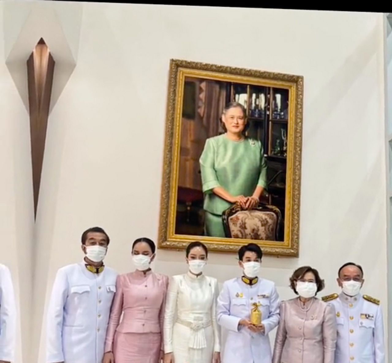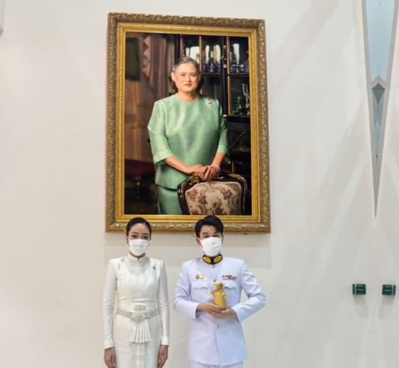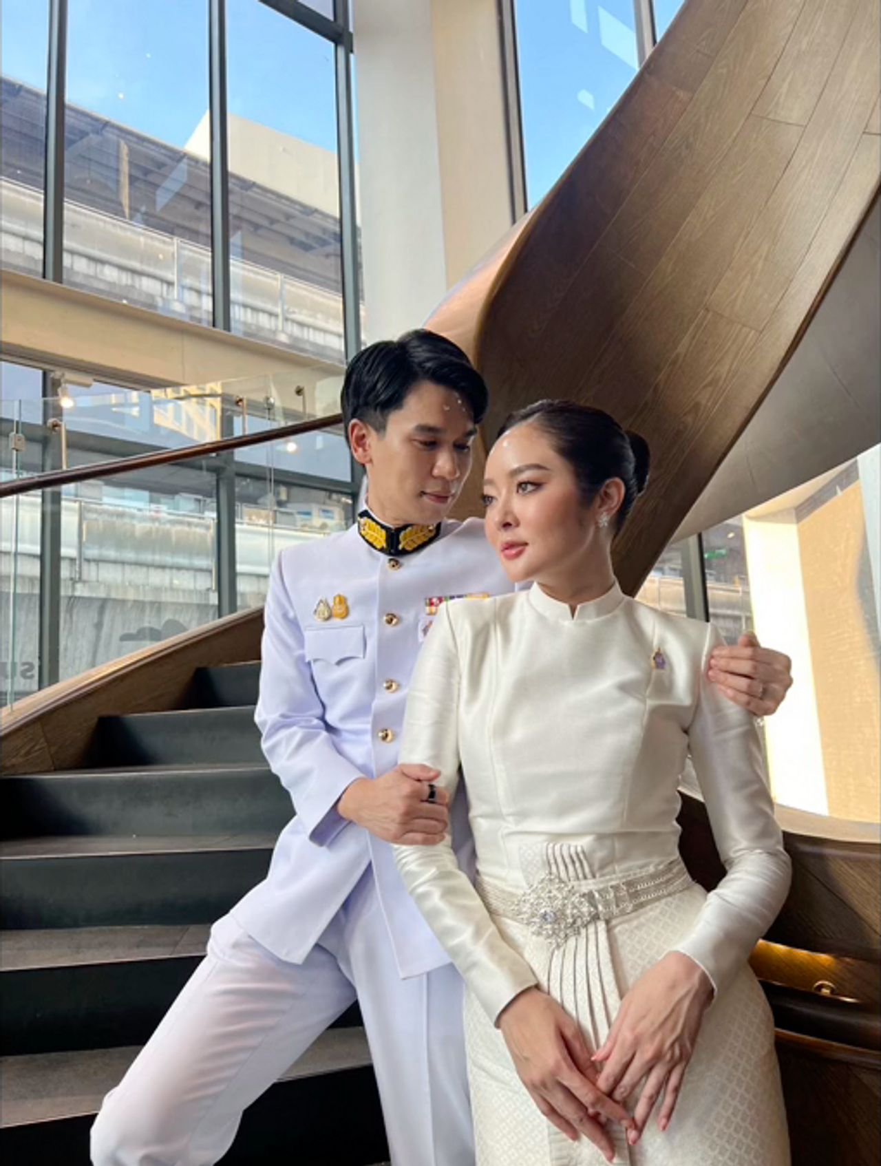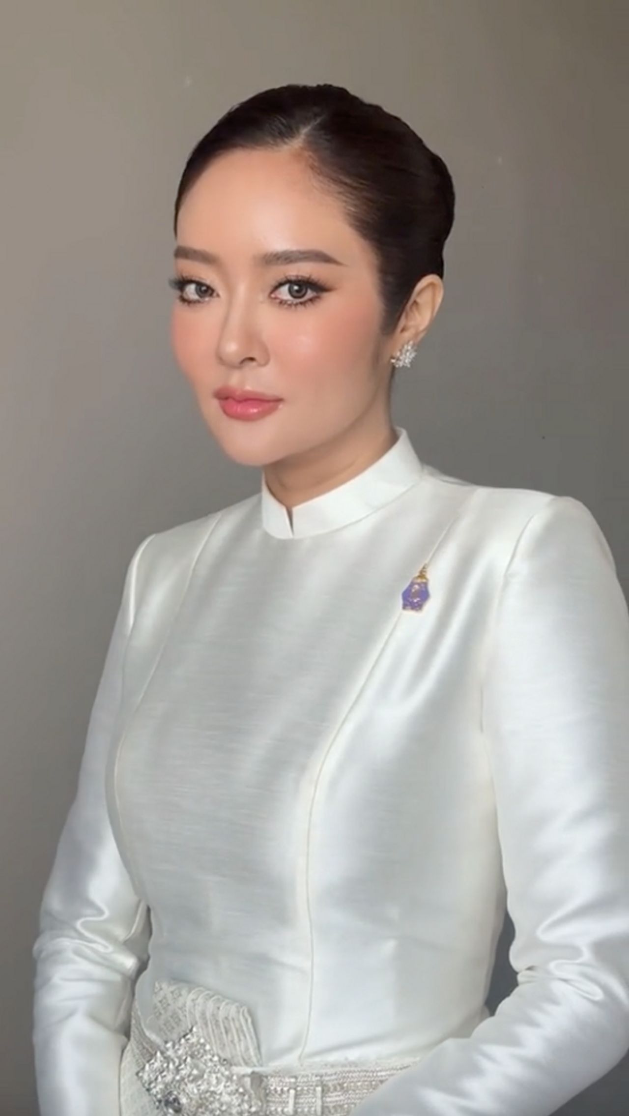 "คุณแก้มบุ๋มสวมชุดไทยบรมพิมาน สีออฟไวท์ขาวบริสุทธิ์จากห้องเสื้อมิลาน ในวันพิธีรับพระราชทานน้ำสังข์สมรส จาก สมเด็จพระกนิษฐาธิราชเจ้า กรมสมเด็จพระเทพรัตนราชสุดาฯ สยามบรมราชกุมารี"